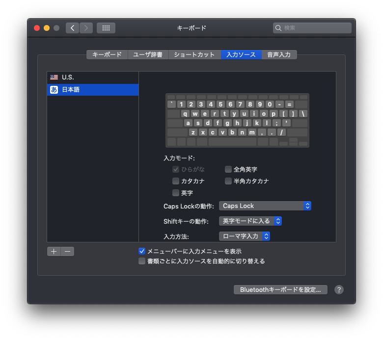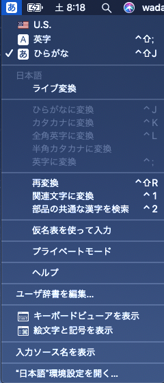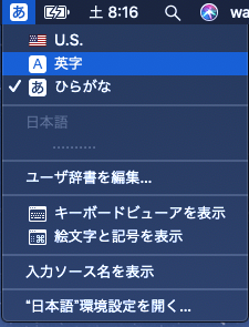 ショートカットキーを押すと画面中央に入力ソースのメニューが表示され、「ひらがな」を選択します。