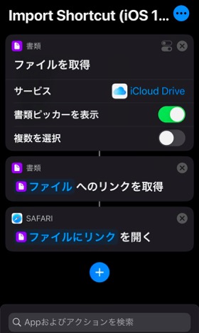 Appleの提供している”ショートカット”というアプリでショートカットを作成したのですが、そのショートカットは月に一度しか使わないのでファイルに保存していました。今までは、使う時だけそのショートカットをアプリに移していたのですが、アプリのバージョンが上がってから、ファイルからの取得、ファイルへの保存ともにできなくなりました。セキュリティは、自分で作ったものなので間違いなく安全です。ファイルからショートカットを取得する方法を教えてください。ショートカットの、ファイルに保存、ファイルから取得の機能を復活させてください。お願いします。