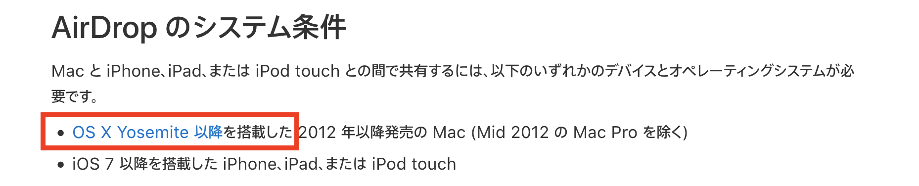 MacBook Air 2014 11-inch 2014を使っています。ソフトウェアはOS X 10.9.5です。Wi-FiもBluetoothもオンになっているのですが、Airdropが使えません。たくさん調べ、できる限りのことはしたのですがやはりできませんでした。「このmacを検索可能なデバイス」という文字も表示されないため大変困っています。