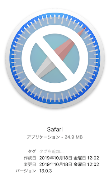 「このバージョンのアプリケーション“Safari”は、このバージョンのmacOSでは使用出来ません。macOS 10.14.6を使用しています。このアプリケーションを使用するにはmacOS10.15以降が必要です。」