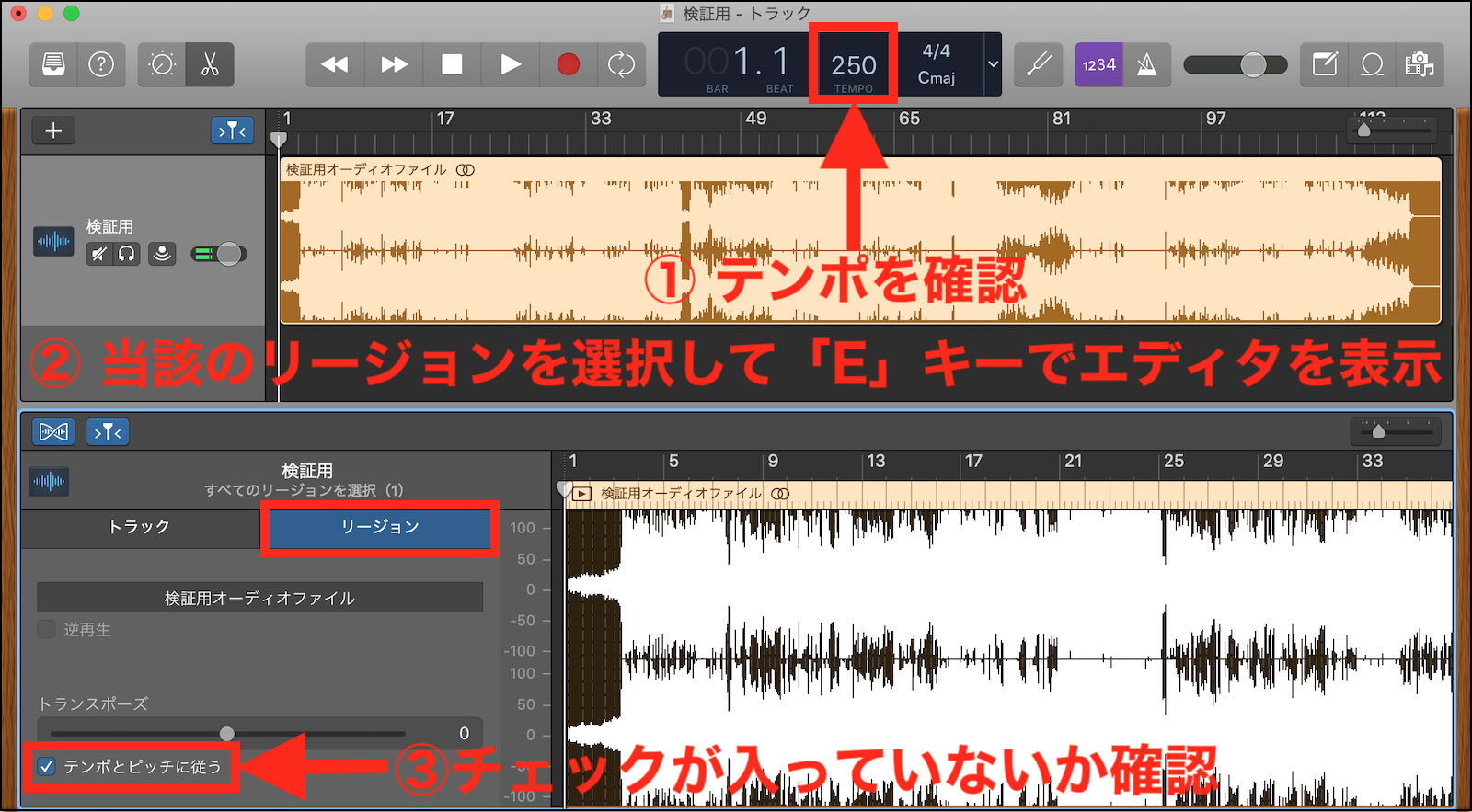 また、下の画像の様に、当該のリージョン(早く再生されてしまうオーディオファイル)を選択して「E」キーでエディタを表示させ、「テンポとピッチに従う」の項目にチェックが入っていないか確認 して見て下さい。