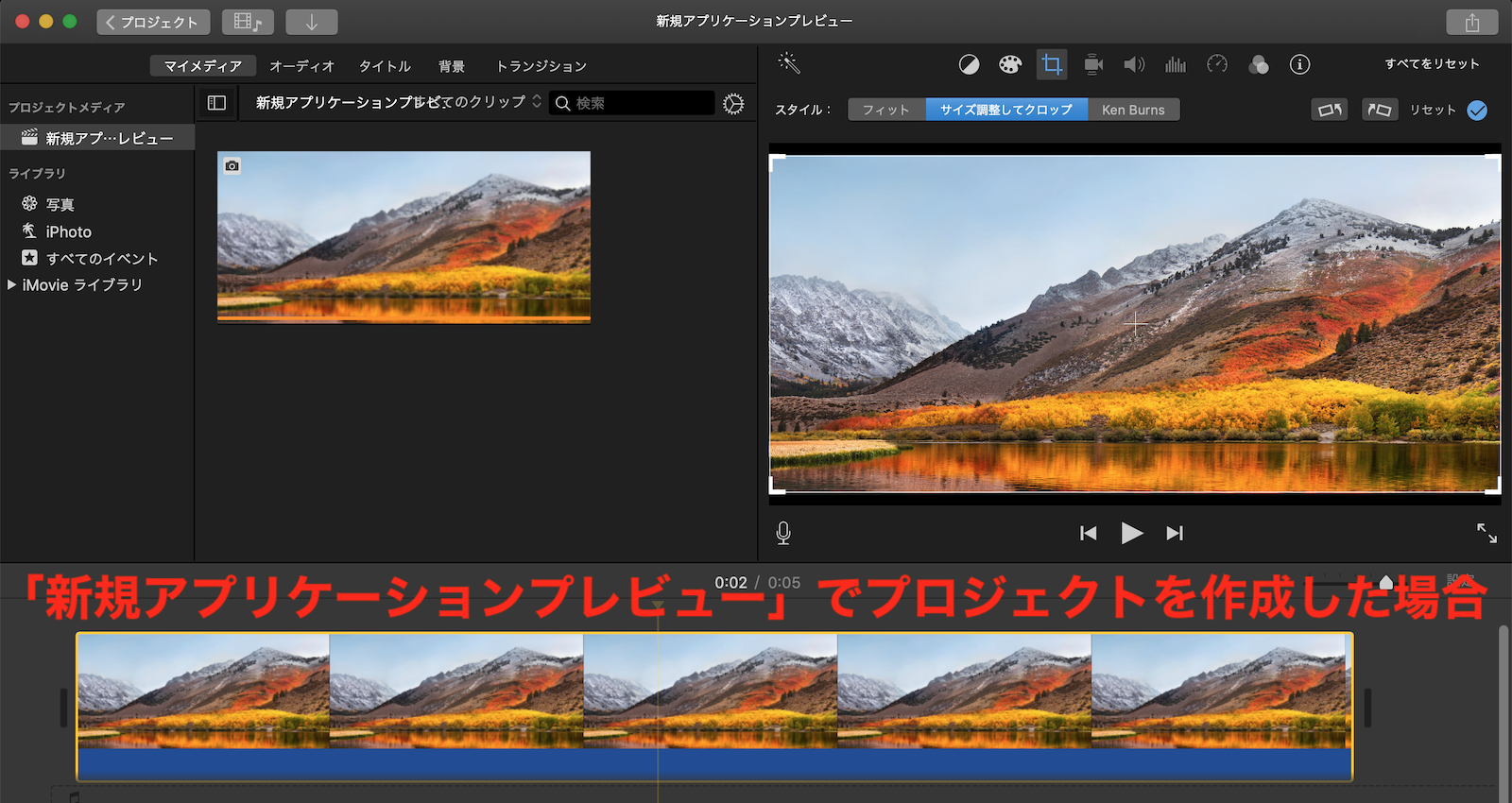 「新規アプリケーションプレビュー」では、一番最初にタイムラインに追加されたクリップのアスペクト比が適用されますので、一番最初にタイムラインに、iPhone X の横向きで撮影した動画クリップを追加 して下さい。