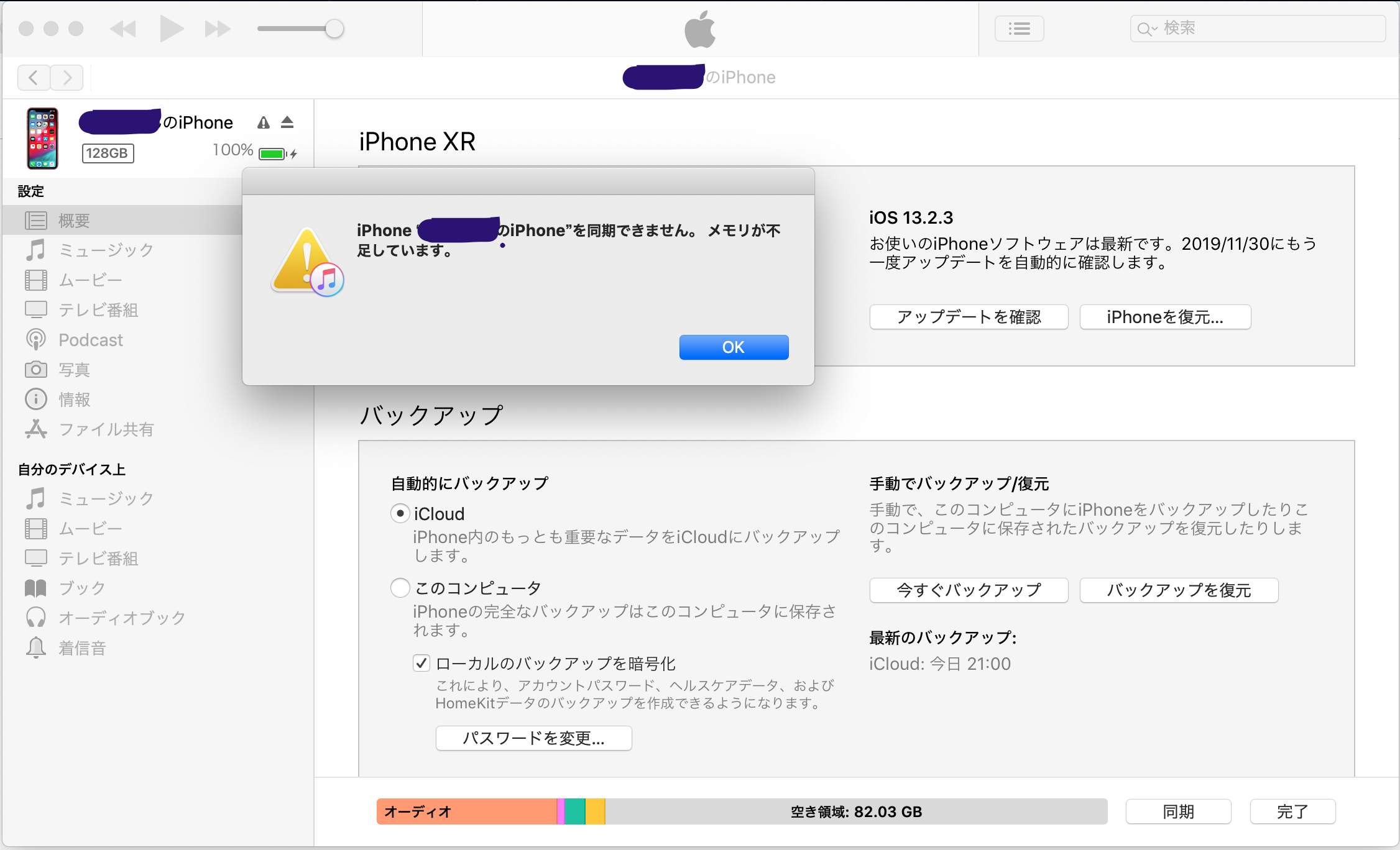 iPhoneを同期すると「メモリが不足しています」のエラー