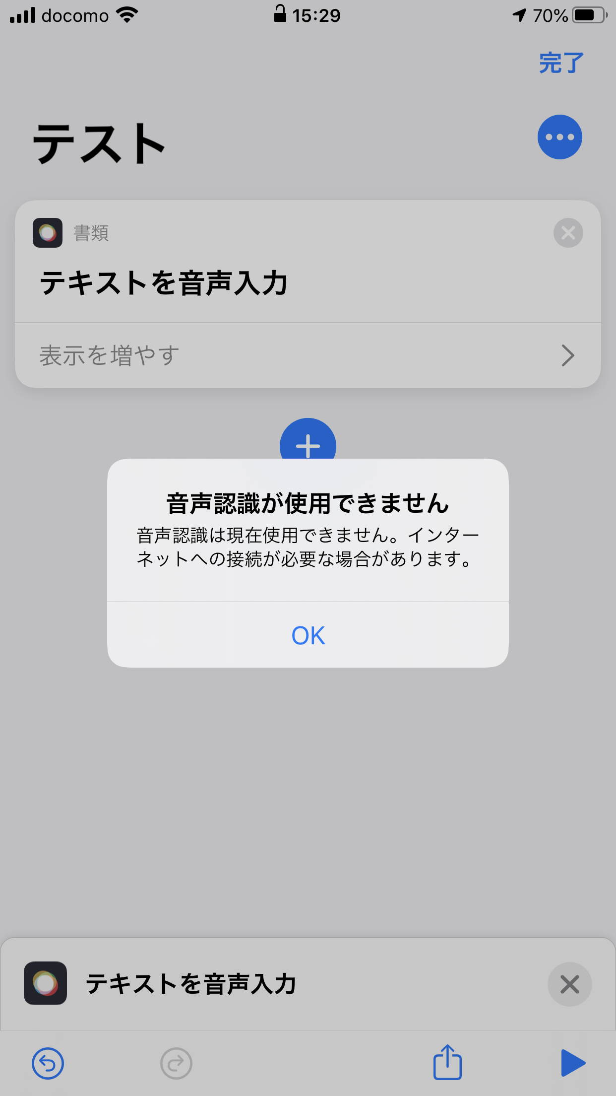 iOSを13.2.3にしてからショートカットの「テキストを音声入力」を使おうとすると「音声認識が使用できません」と表示され使えなくなりました。