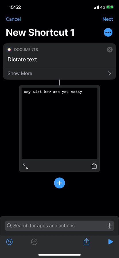 1)私のiPhone(iOS ver. 13.2.3)のショートカットでは『音声入力』のアクションは正常に実行できますね。 お使いのiPhoneのOSのバージョンはどのようになっていますか?
