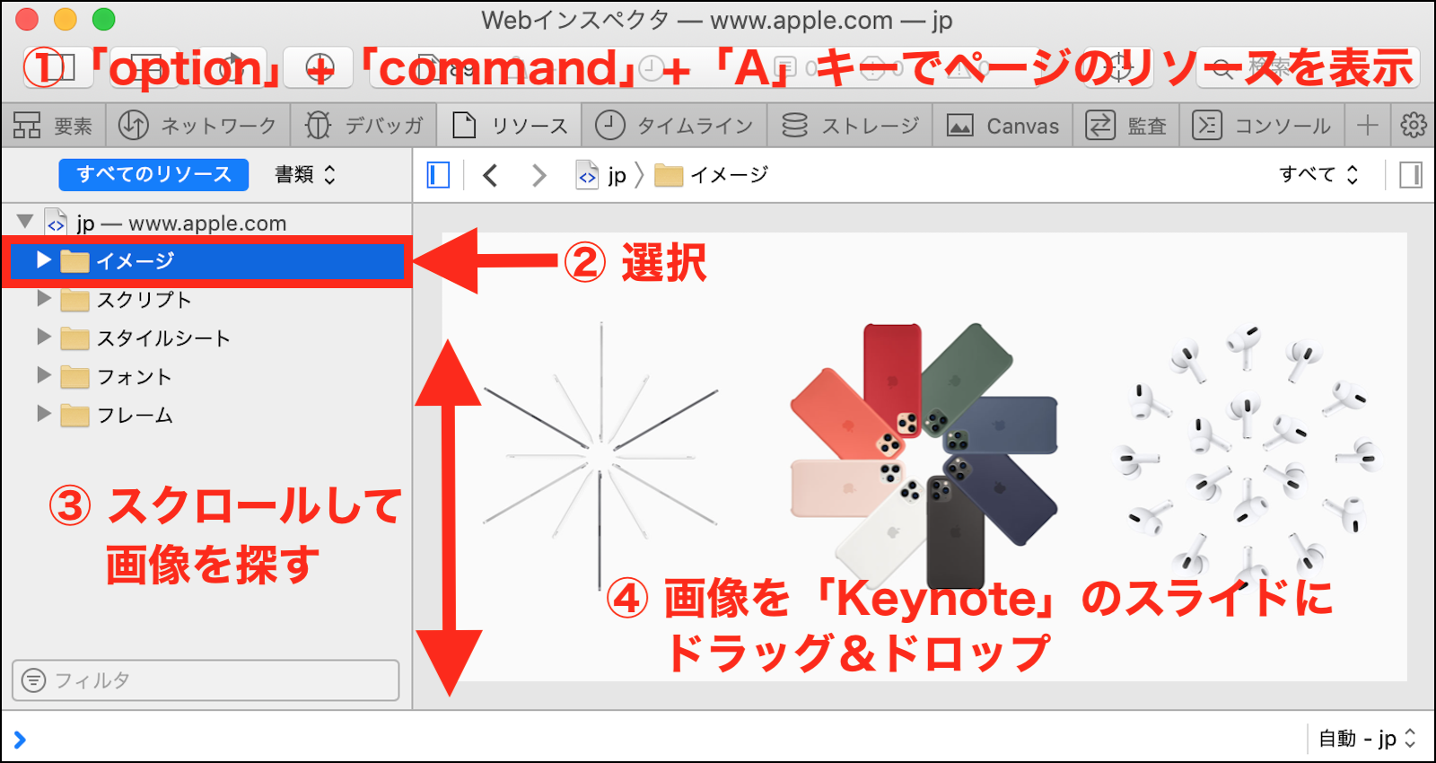 Web ページの画像を、「Keynote」のスライドにドラッグ&ドロップすると URL になってしまう場合の応急措置ですが、下の画像の様に「option」+「command」+「A」キーでページのリソースを表示させ、「イメージ」フォルダを選択し、右側の画像をスクロールして目的の画像を見付けたら、「Keynote」のスライドにドラッグ&ドロップ して下さい。