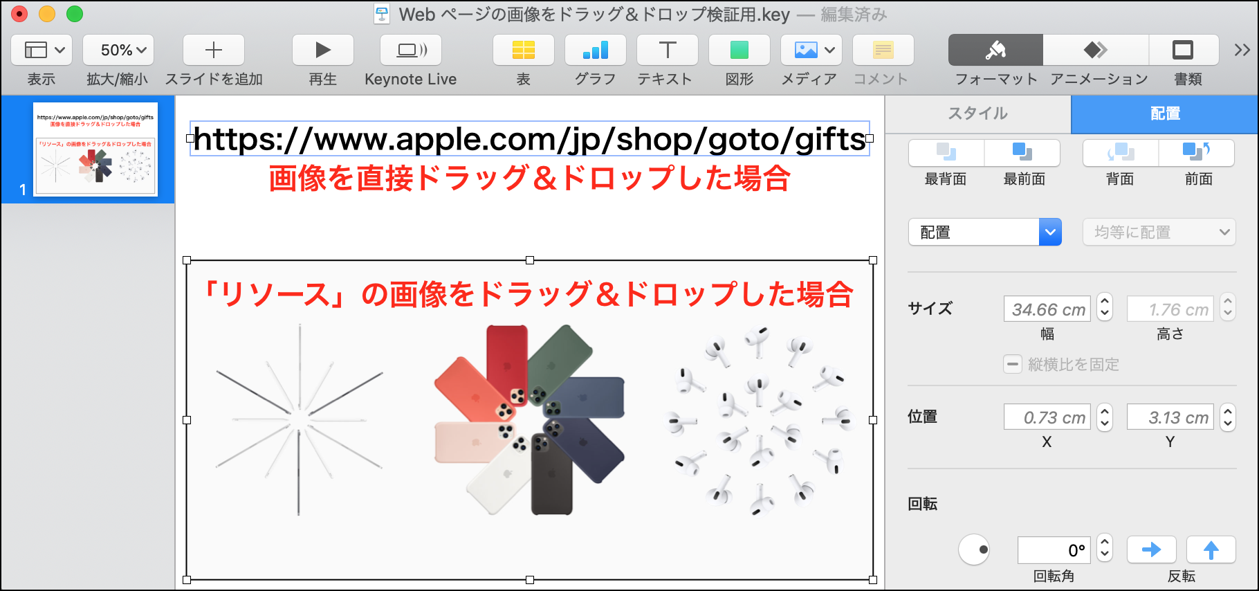例えば、Apple の公式サイトの画像でも、「Keynote」のスライドにドラッグ&ドロップすると URL になってしまう画像と、全く問題無く画像として「Keynote」のスライドにドラッグ&ドロップ出来る画像(リンク付き画像も含む)が有ります。