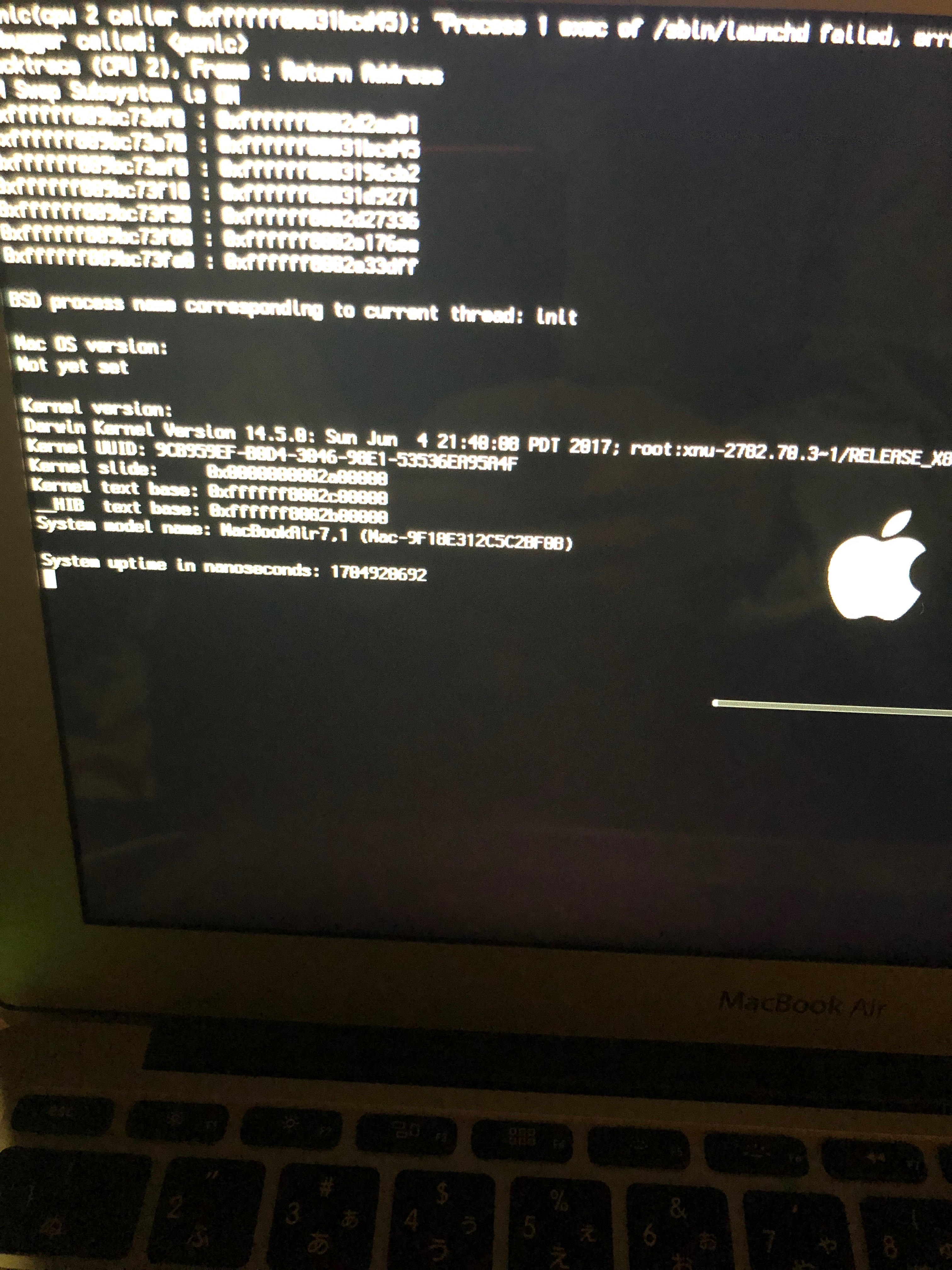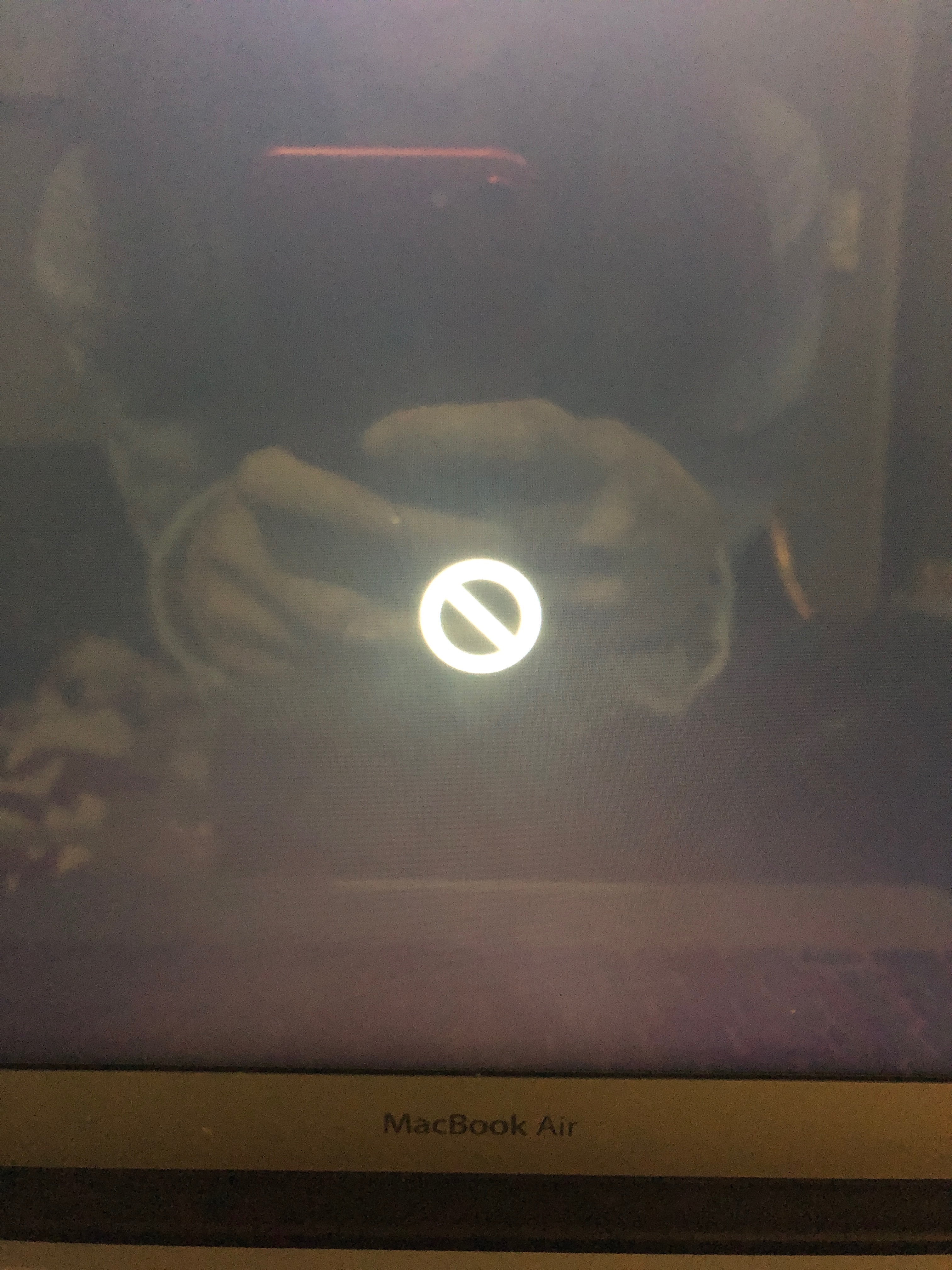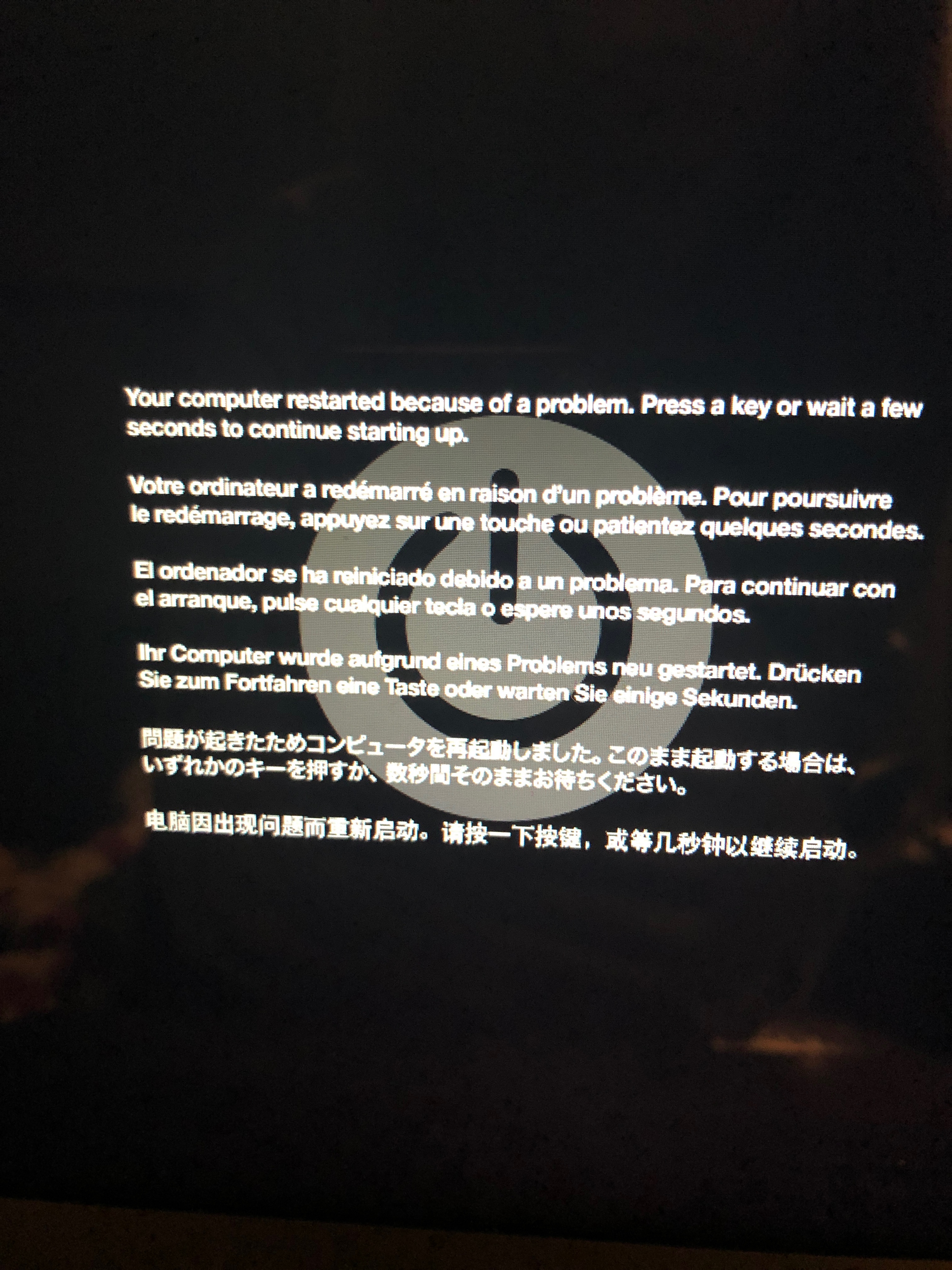 「問題が起きたためコンピューターを再起動しました。このまま起動する場合は、いずれかのキーを押すか数秒間そのままお待ち下さい。」という画面と、アップルマークと英数字が羅列された画面が交互に出て、最後は駐車禁止のようなマークが出て真っ暗になります。