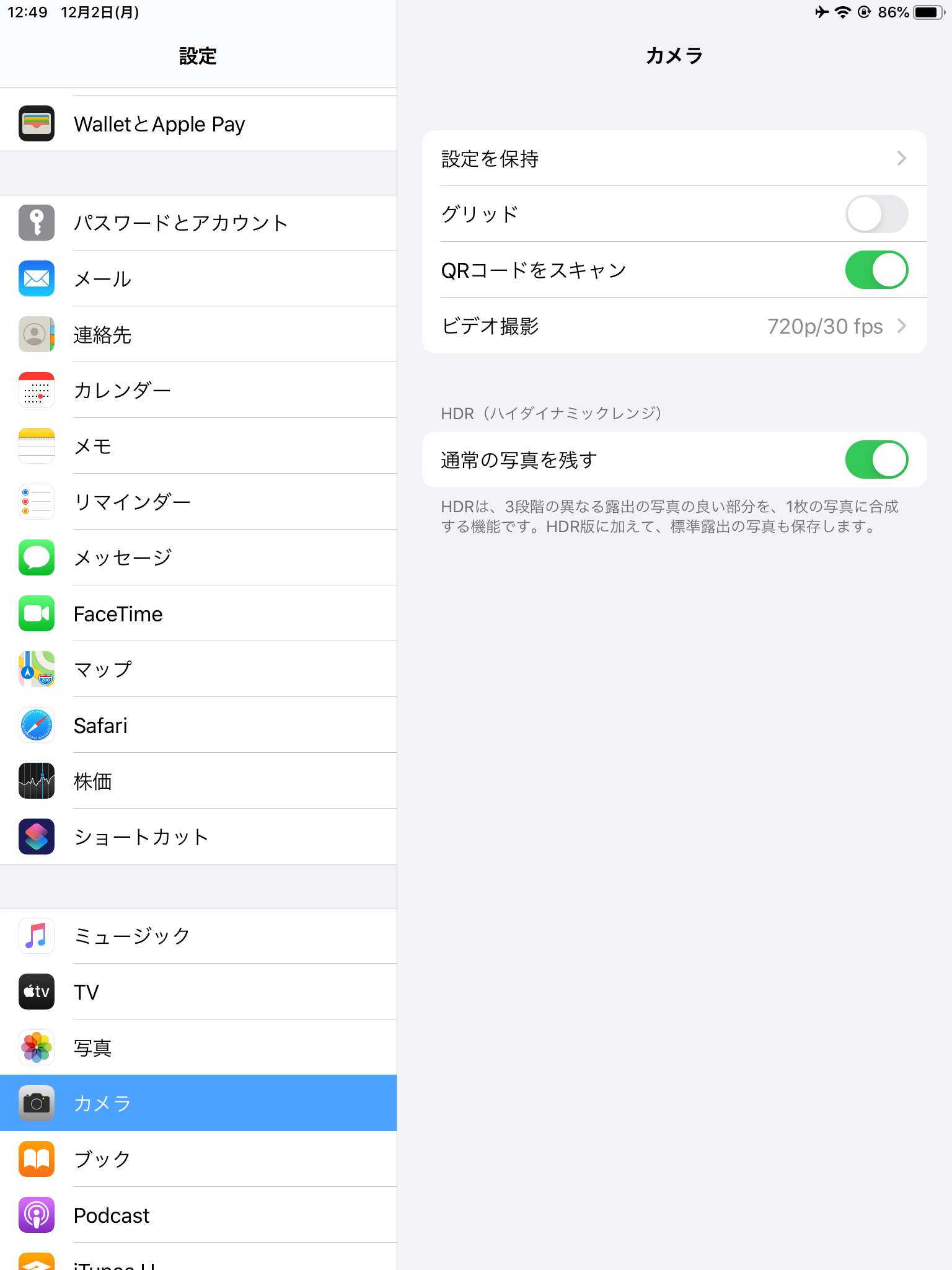 Ios13のipad miniでカメラのフォーマットを変更したいのですが フォーマットの項目がありません。