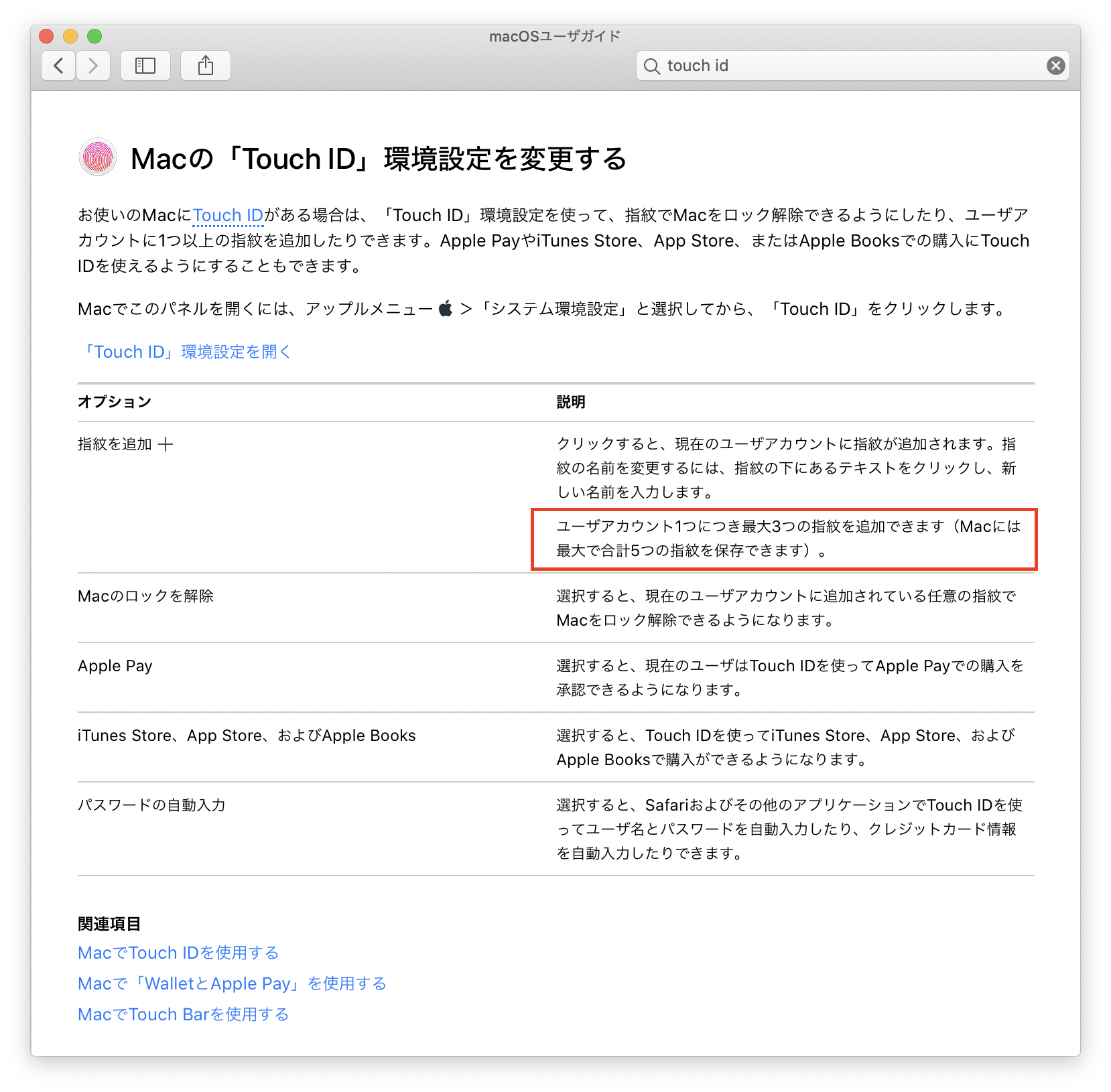 指紋登録の上限は、Mac1台につき5件、1ユーザーにつき3件までです。