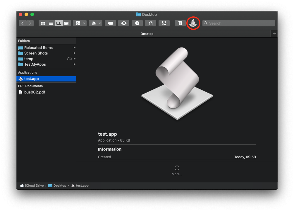 Script Editor.appを起動して、以下のコードをアプリケーション形式で保存して下さい。 保存したアプリをコマンドキーを押しながら、Finder.appのツールバーにドラック&ドロップして、ツールバーに登録します。 そのアプリを起動したり、ツールバーのアプリを動かすとお望みの処理を実行できませんか?