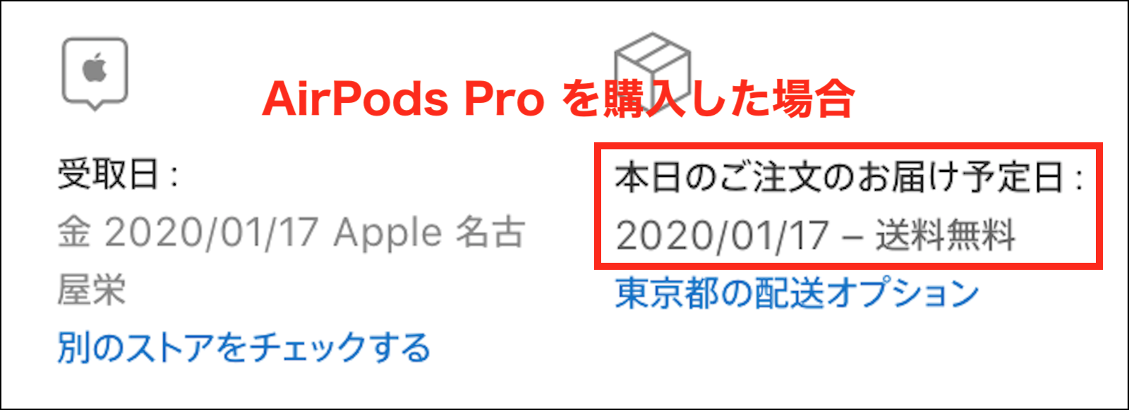 購入されたのが AirPods Pro の場合は、AirPods Pro の在庫が不足している所為か、下の画像の様に「本日のご注文のお届け予定日」が 2020 年 1 月 17 日(れなーるさんがお住いの地域によっては、18 日)と表示されています ので、1ヶ月以上待つ可能性が有りますね。