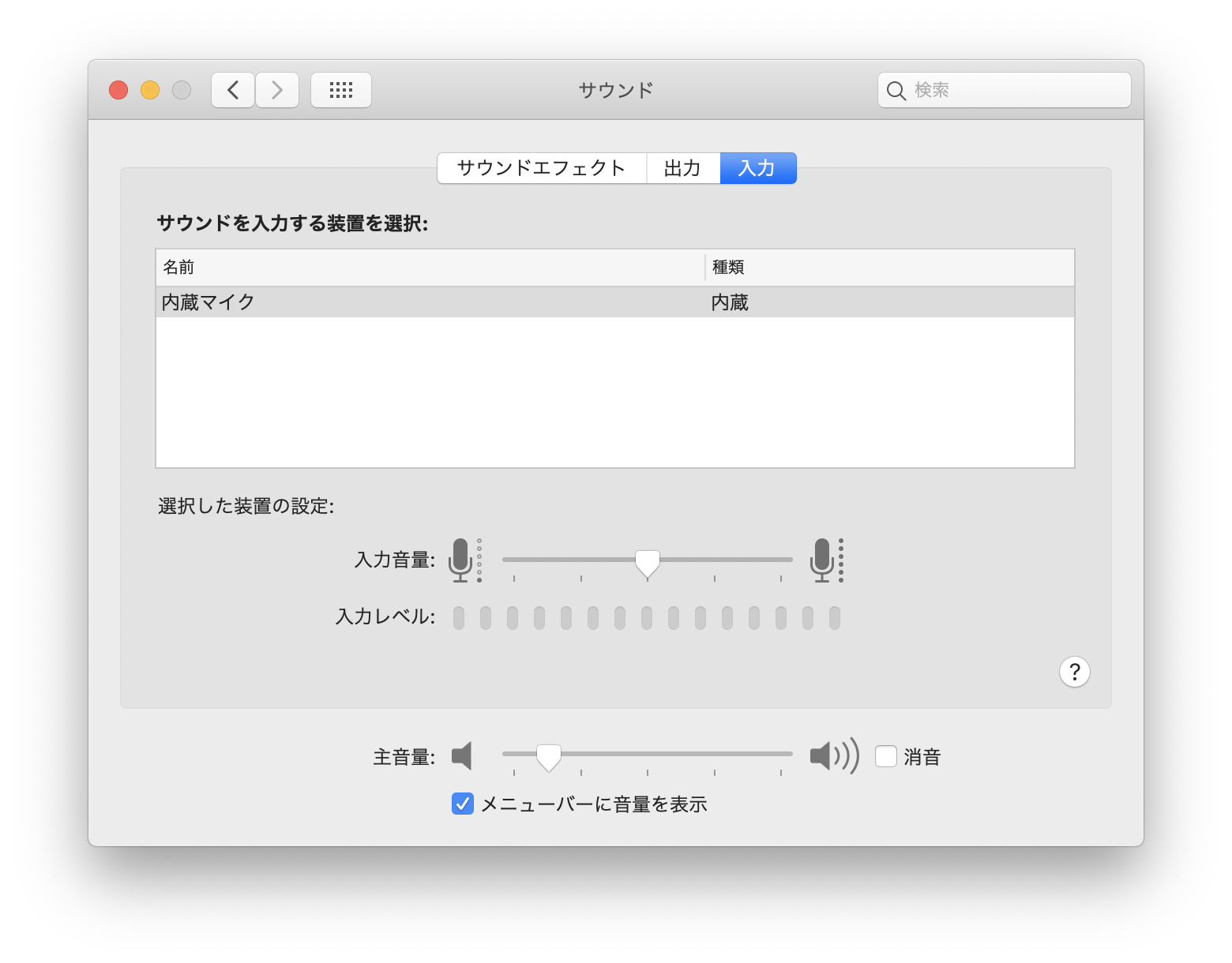 システム環境設定のサウンド入力は内蔵マイクが選択されています。