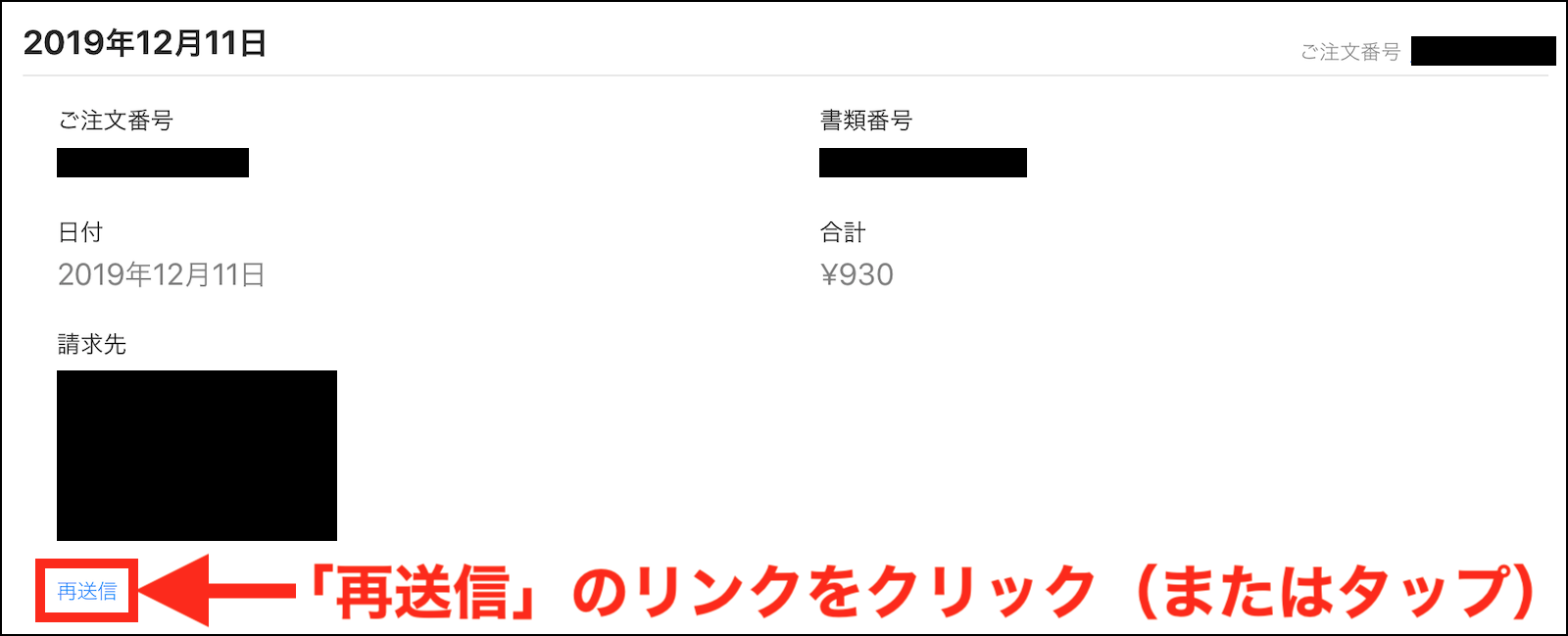 下の画像の様に、「ご注文内容」が表示されますので、「再送信」のリンクをクリック(またはタップ)して、「領収書」メールを再送信 して下さい。