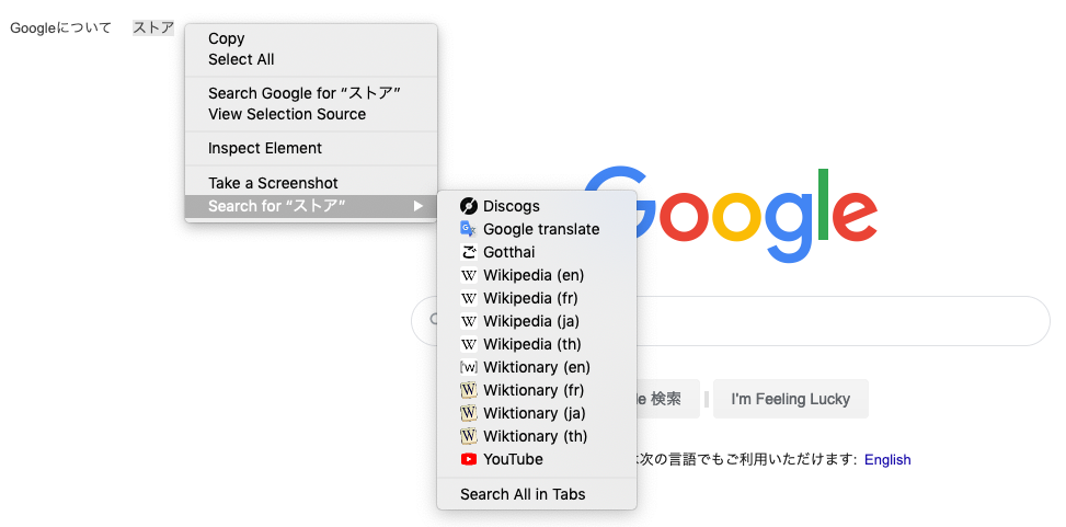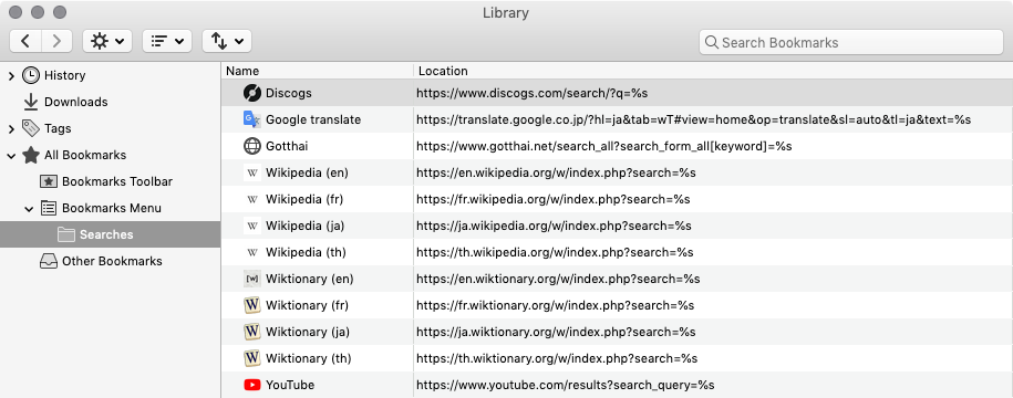 設定はブックマークに"Searches"というフォルダーを作り、URLを書きます。選択文字列は"%s"と入れ替わります。