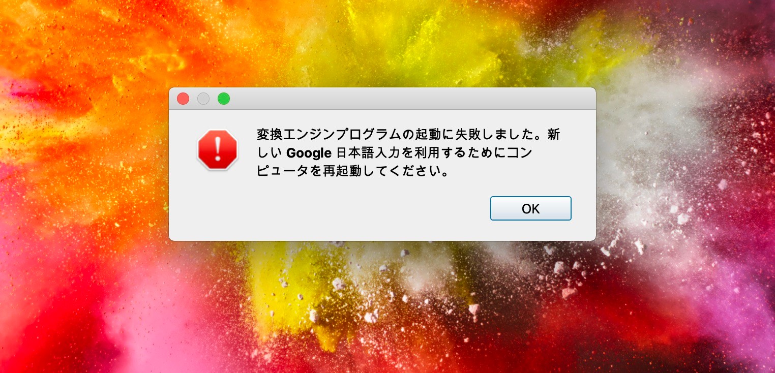 >mac 変換エンジンプログラムの起動に失敗しました。新しいGoogle日本語入力を利用するためにコンピュータを再起動してください。