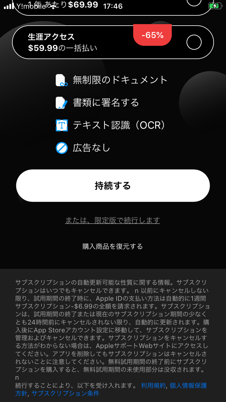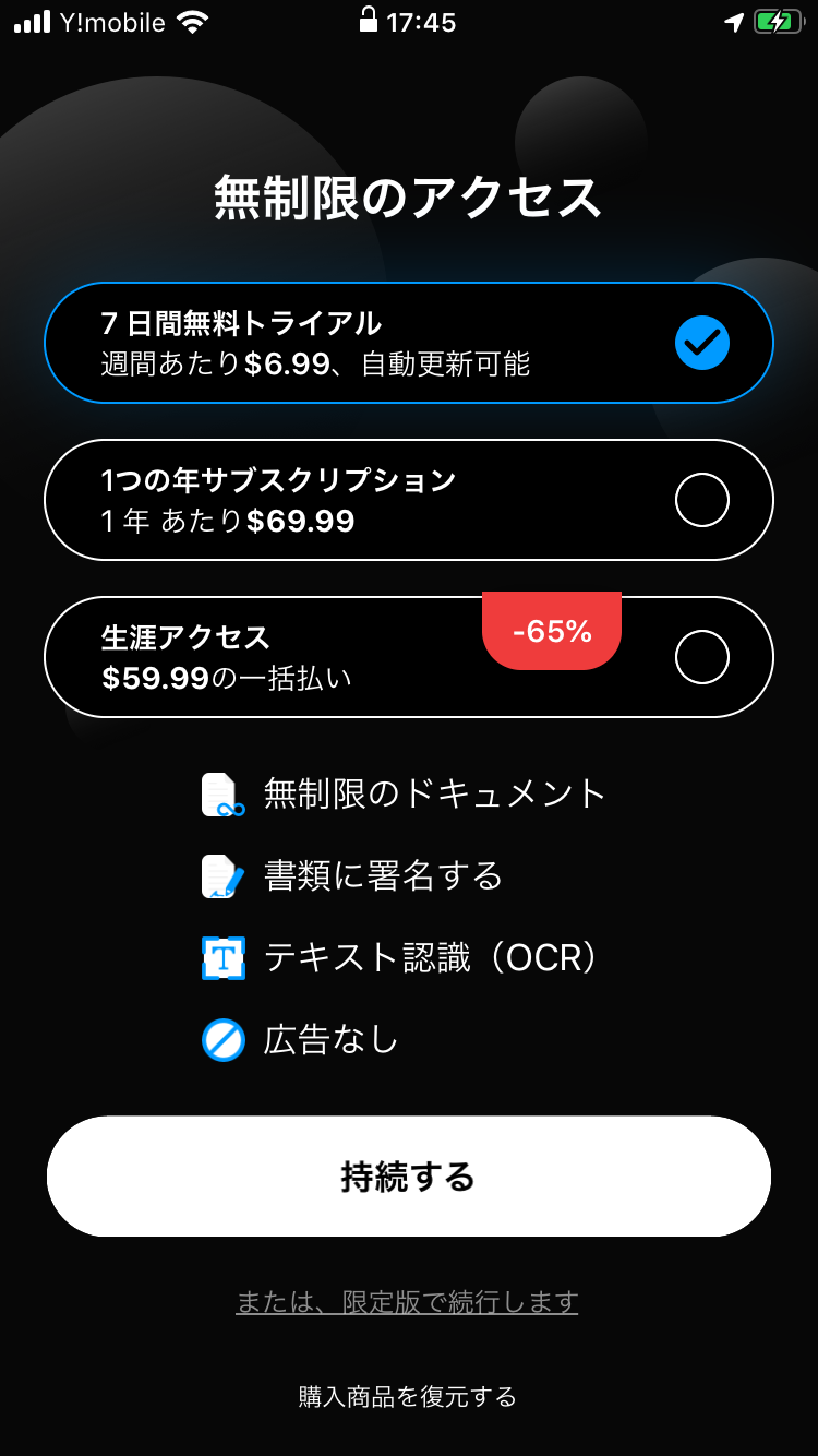 この画面が表示された時に「または、限定版で続行します」をタップするか「持続する」をタップせずに画面を閉じてしまうと無料トライアル期間には入りません。
