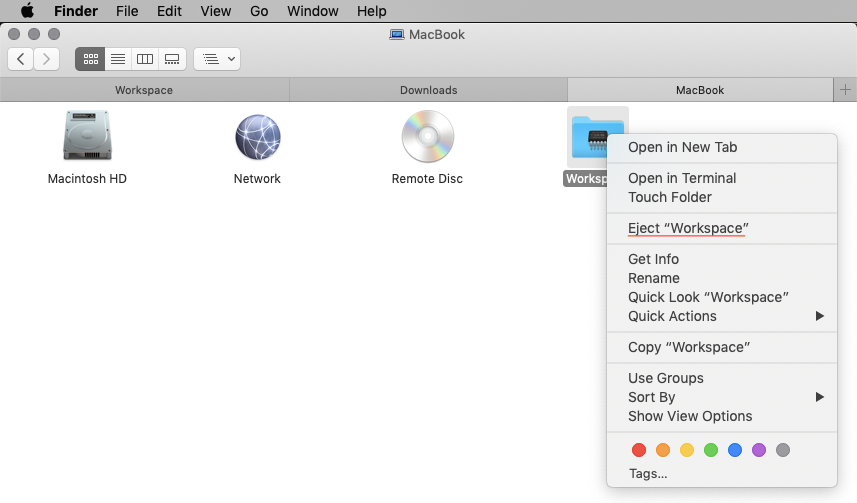 Workspaceという名称は私の環境での話で、ここにマウントしているボリューム名(USB接続されたカメラの名称?)が出てきます。