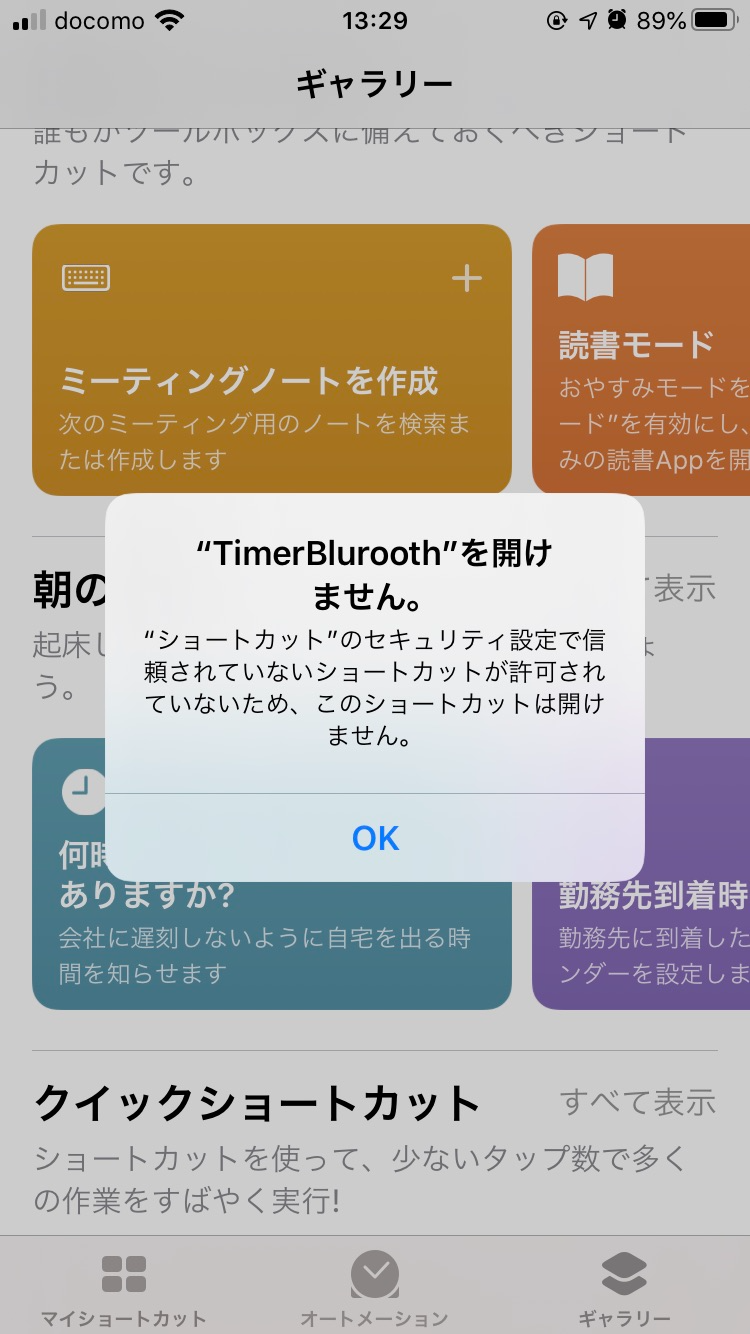 信頼されていないショートカットを許可して試してみます