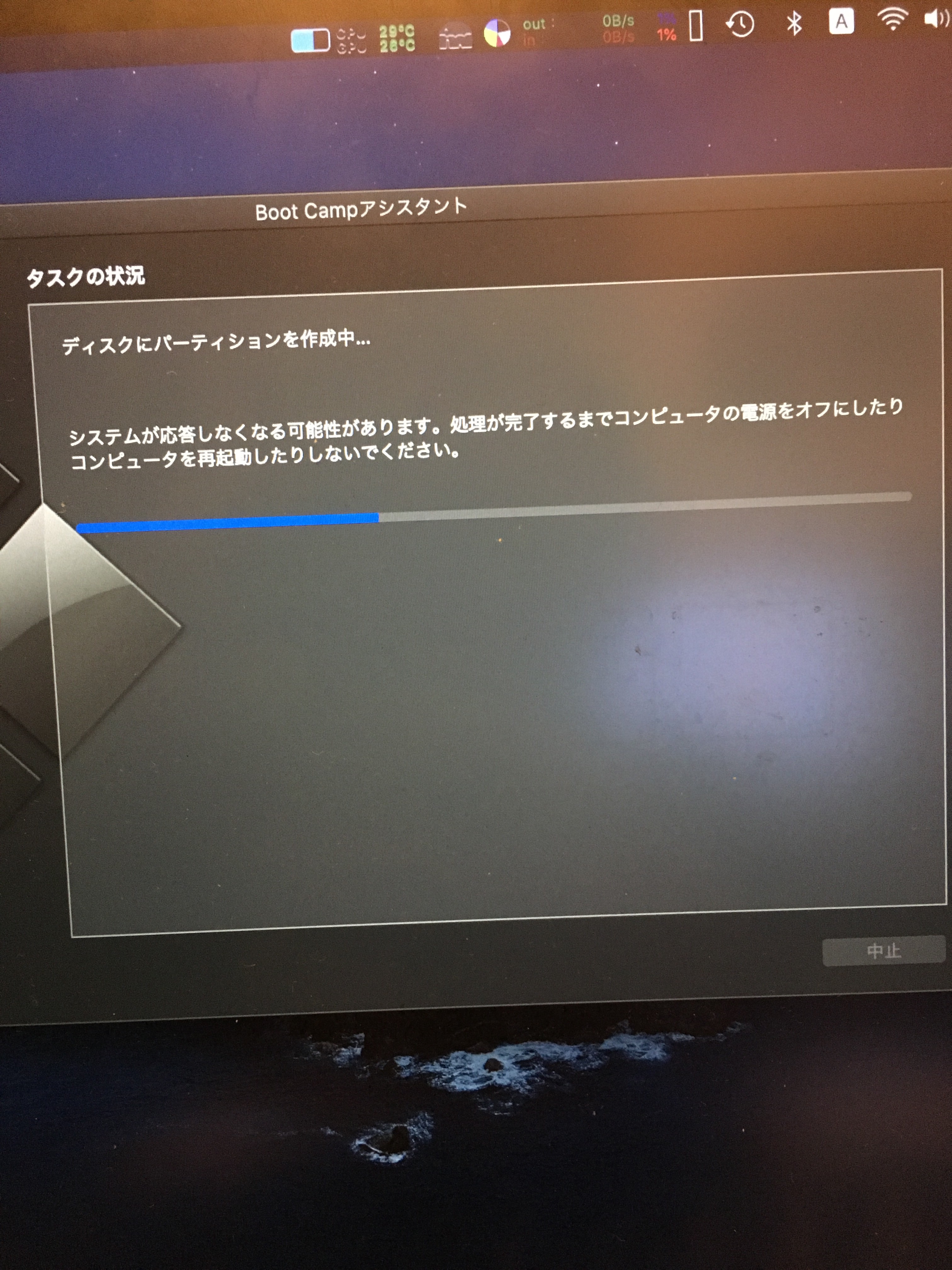 Macbook proにWindows10を入れるためにBootCampアシスタントを用いているのですが、ディスクにパーティションを作成中となってから半日以上経過しても進みません