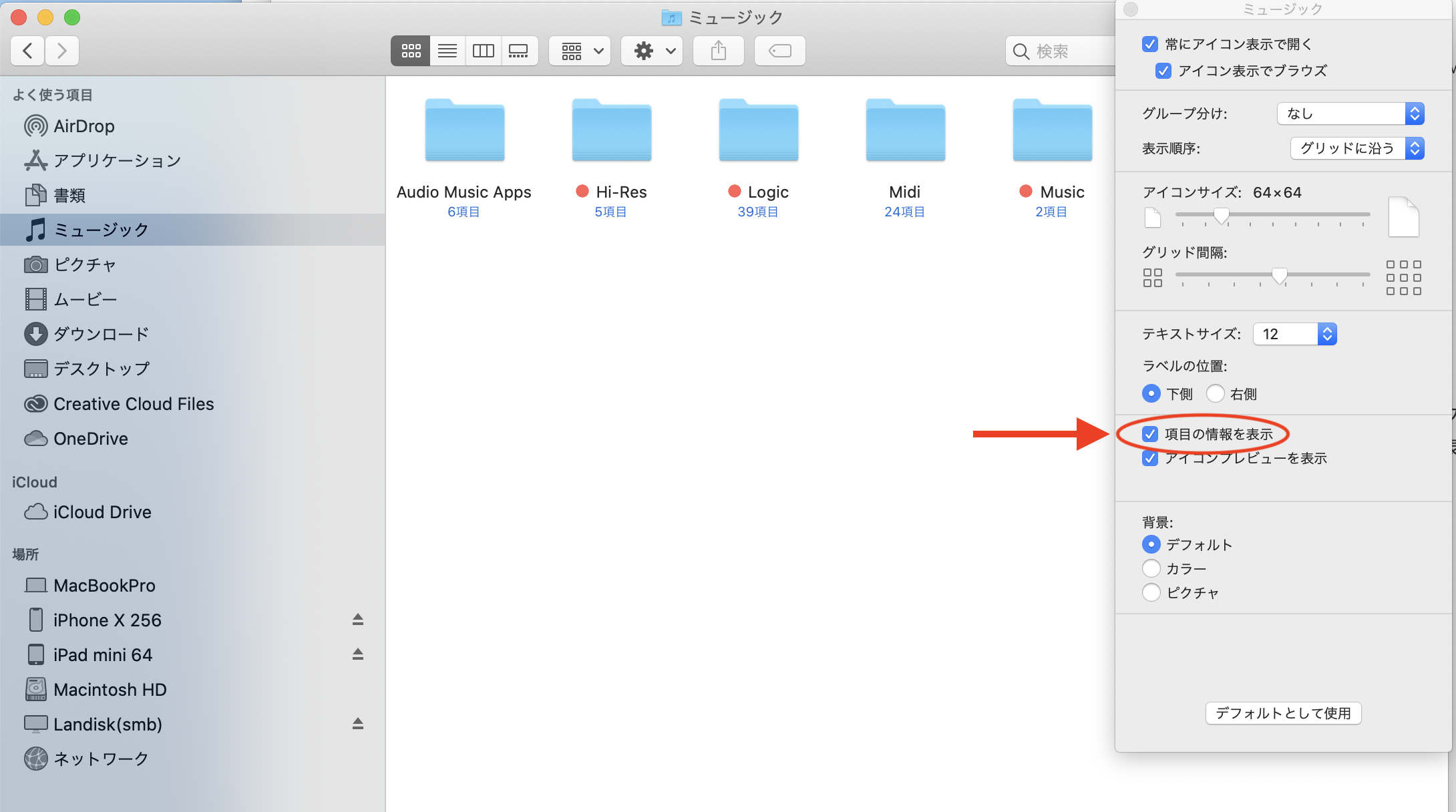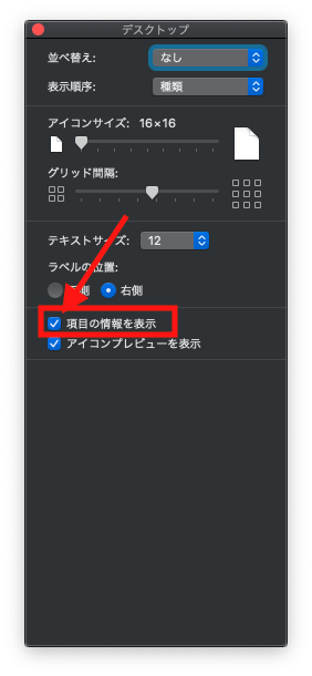 Finder.appの『表示』メニューから、『表示オプションを表示 ⌘J 』を実行して、『項目の情報を表示』にチェックを入れます(下図)。