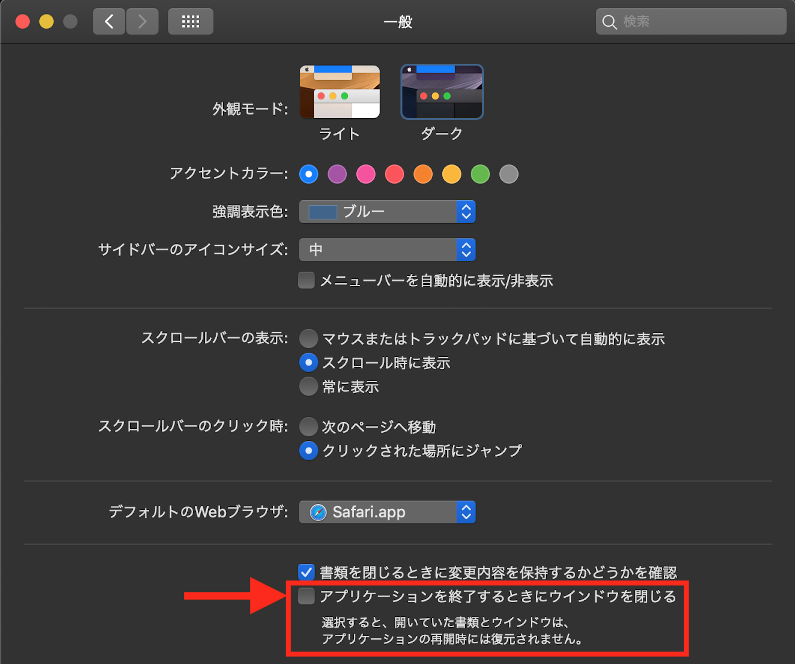 「システム環境設定」>「一般」>「アプリケーションを閉じるときにウインドウを閉じる」の設定は、