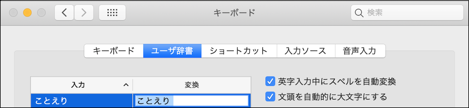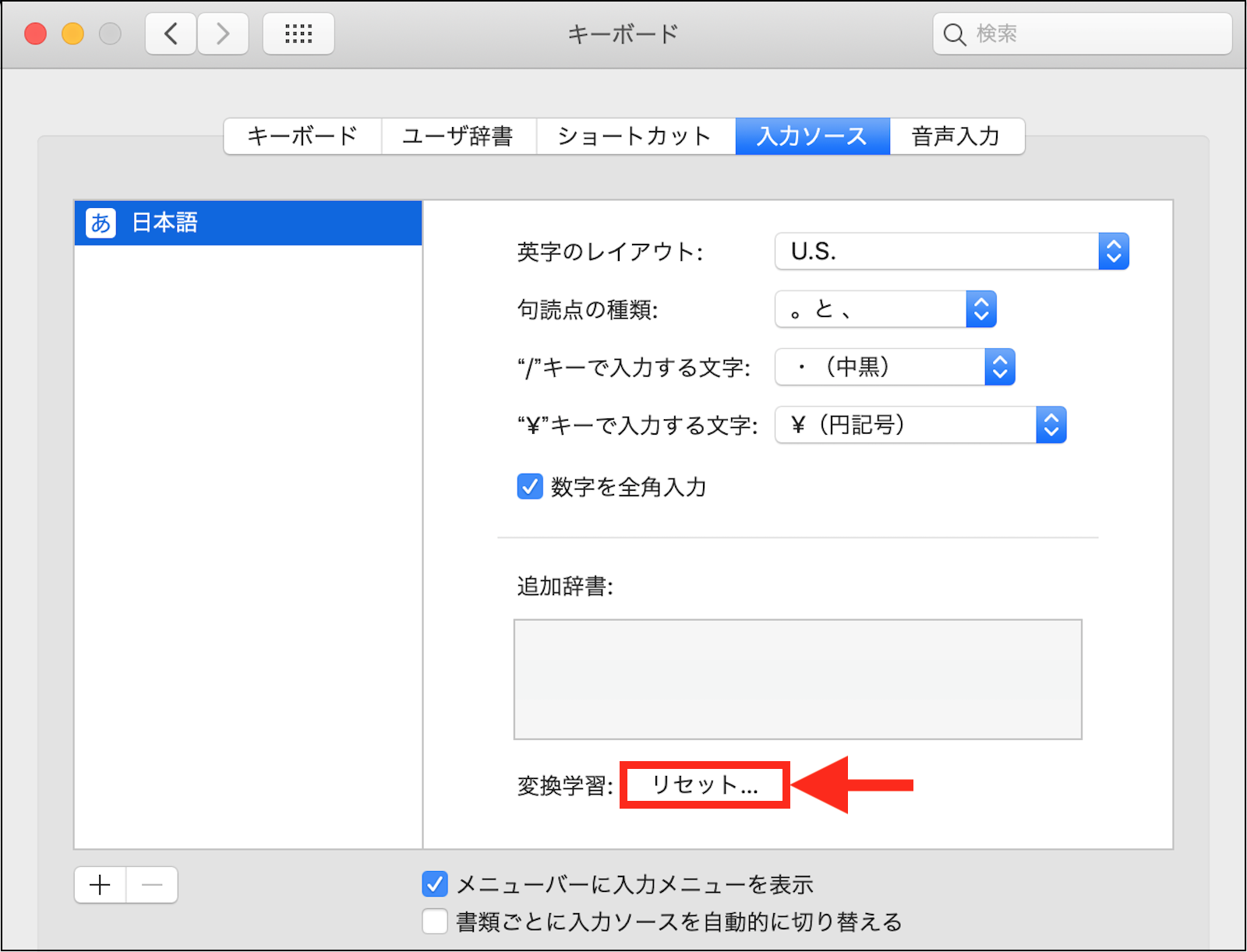 登録されていない場合は、「ライブ変換」の「変換学習」自体に、何らかの不具合が発生している可能性が有りますので、「システム環境設定」>「キーボード」>「入力ソース」タブで、下の画像の様に「日本語」を選択して、右側の設定項目を一番下までスクロールすると表示される、「変換学習」の「リセット」ボタンをクリックして、「変換学習」をリセットして下さい。