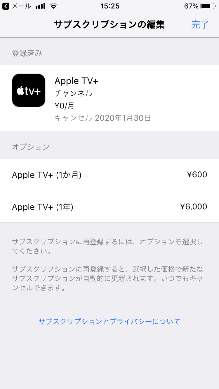 サブスクリプションApple TV+購入日2020年1月30日初回オファー1年無料サブスクリプション料金2021年1月30日から月額¥600