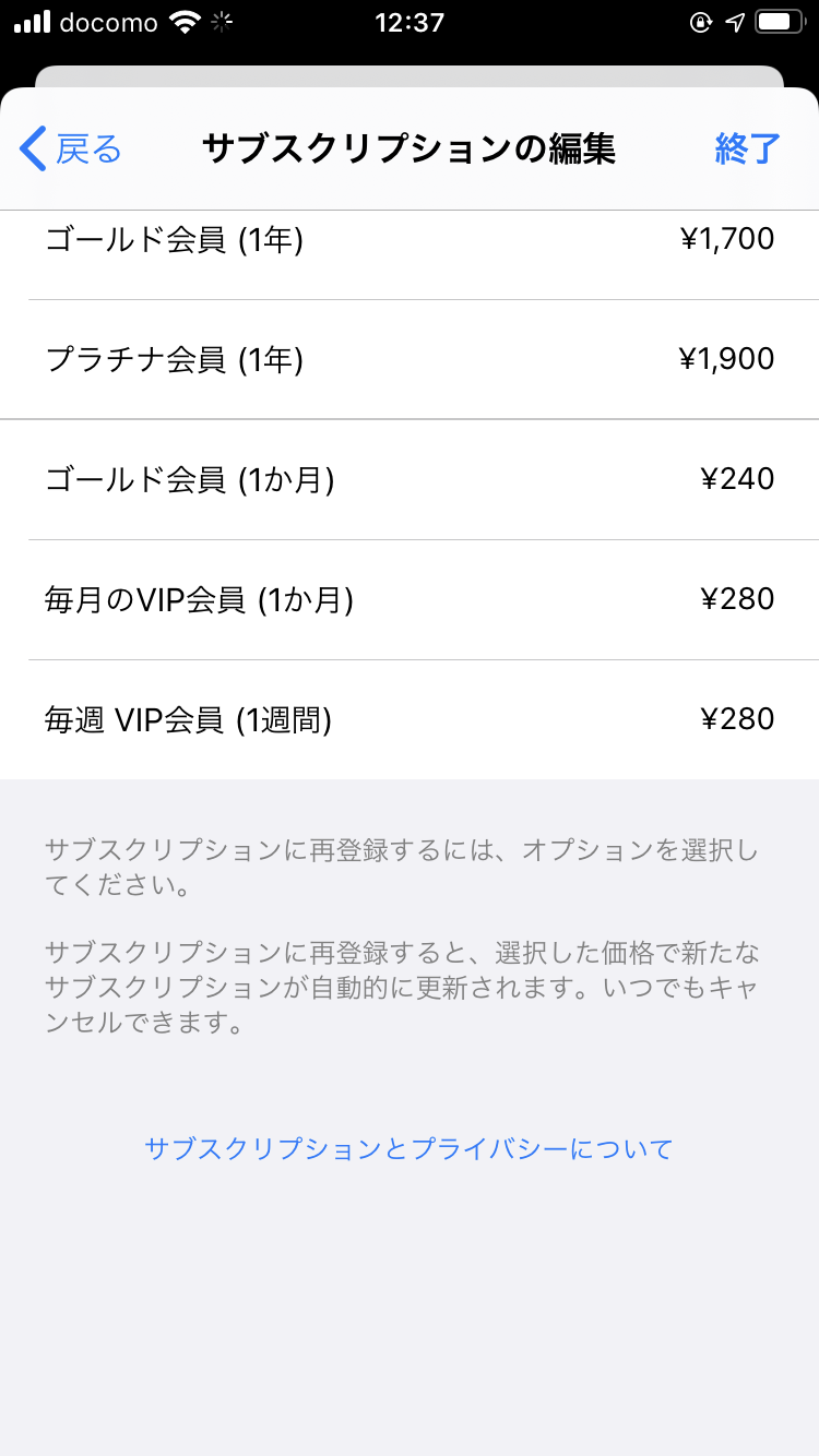 下からふたつ目の 毎月のVIP会員(1カ月) は280円/月で毎月の支払いも一致します。