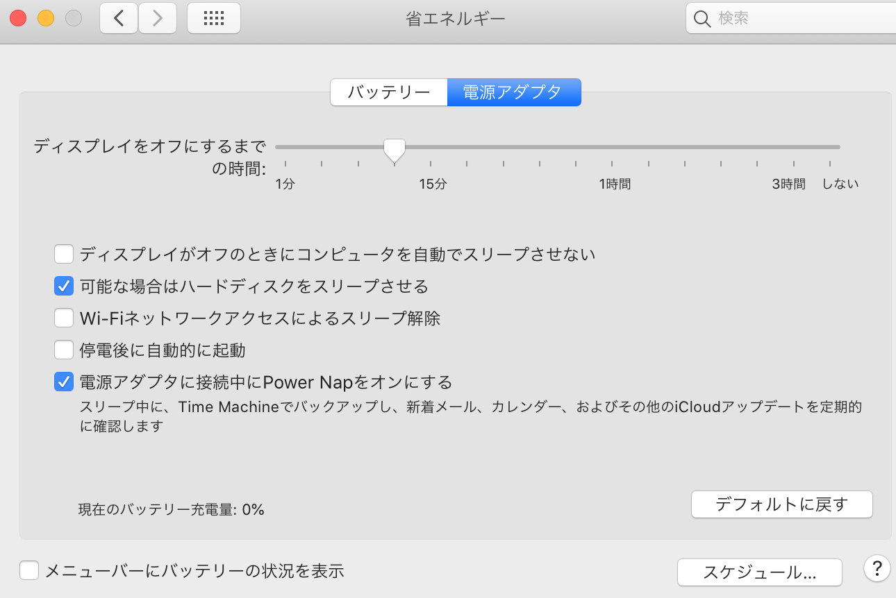 「メニューバーにバッテリーの状況を表示」にチェックを入れても、すぐに勝手にチェックが外されます。