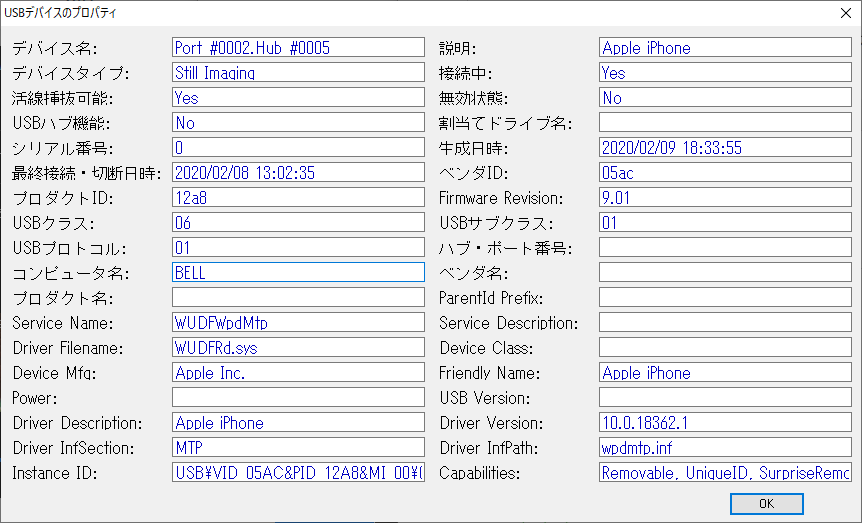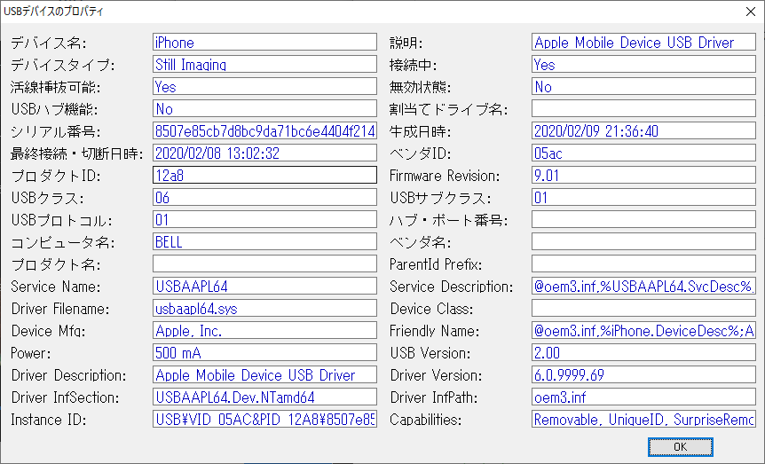 ドライバーなどに異常があるかもしれないので、エクスプローラでのiPhoneデバイスのプロパティと、フリーソフトのUSBDeviewでのApple iPhoneとApple Mobile Device USB Driverのプロパティを添付します。