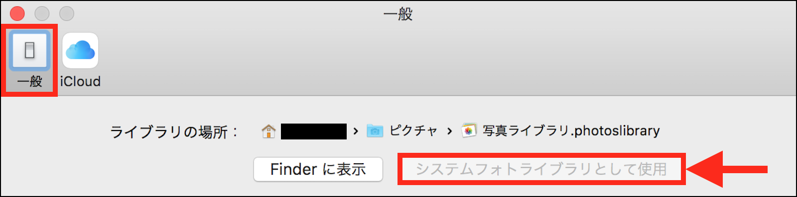 また、「Finder」で「写真ライブラリ.photoslibrary」をダブルクリックして開き、下の画像の様に「写真」メニュー >「環境設定」>「一般」タブの「システムフォトライブラリとして使用」ボタンがグレーアウトしているかどうか確認 して見て下さい。