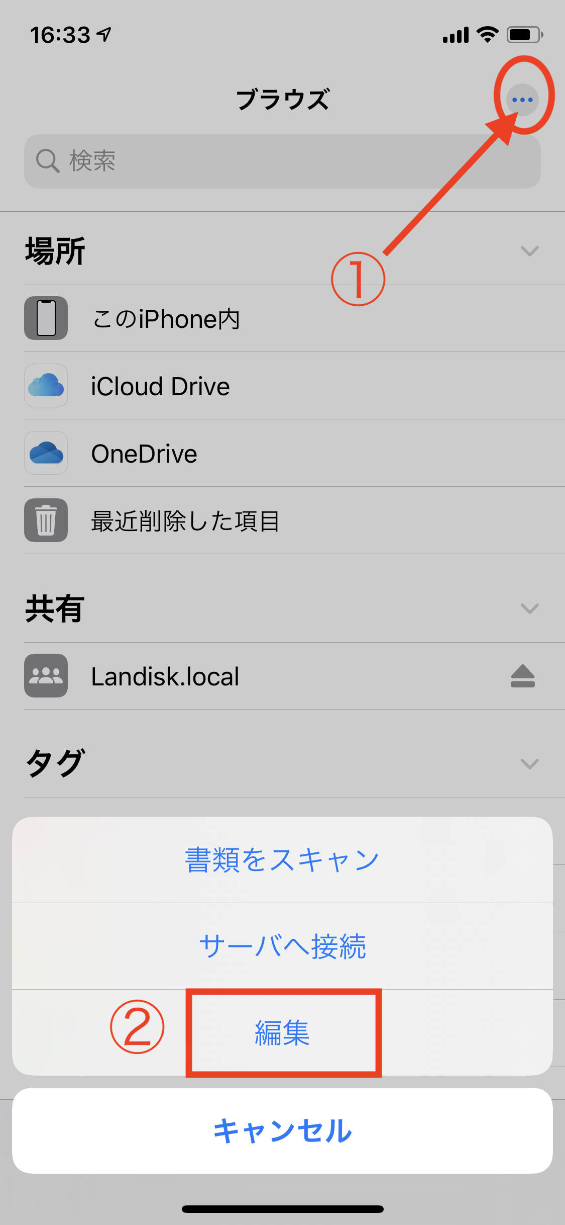 > ファイルアプリを起動して、『ブラウズ』を表示させて、右上にある、…のマークをタップして、編集をタップすると、