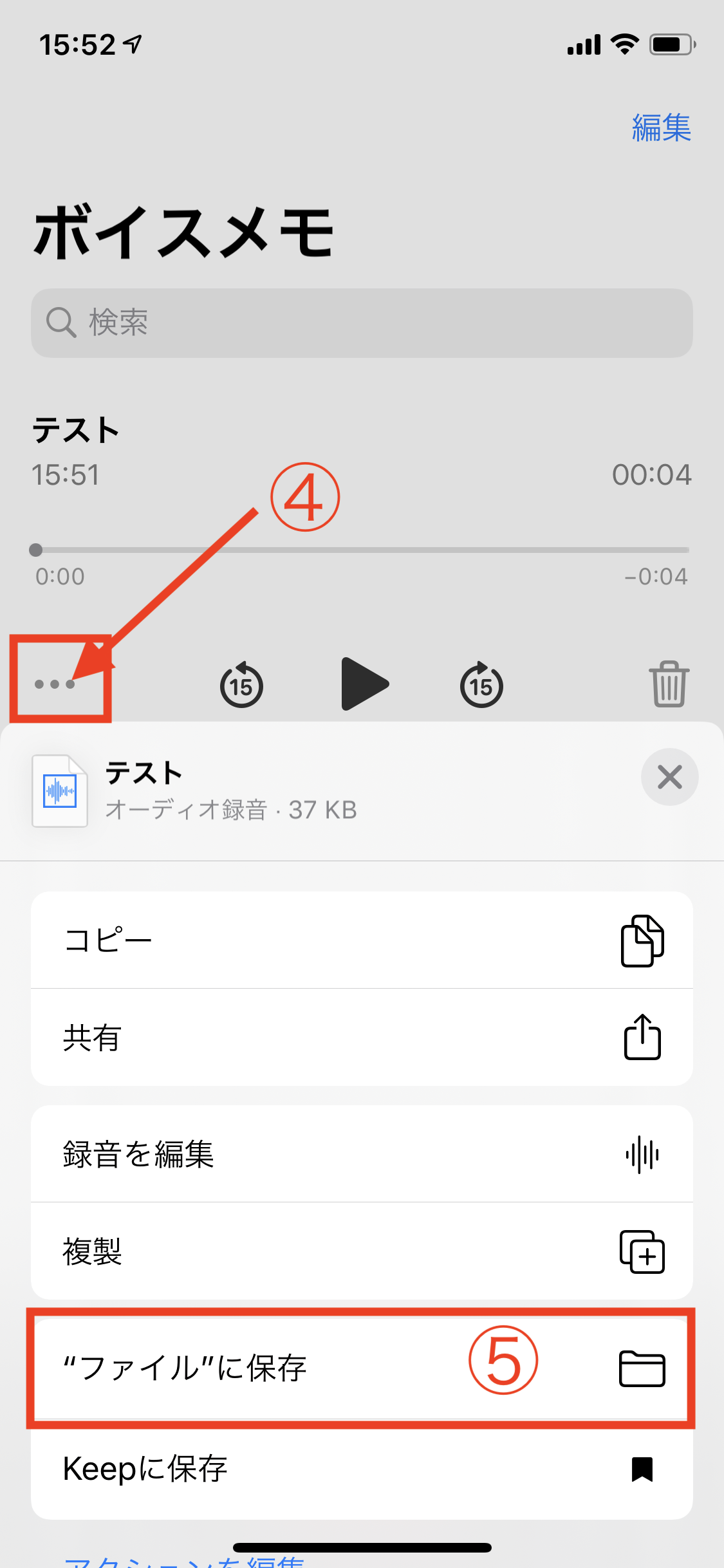 あるいは、ボイスメモアプリで音声フィルの左側にある、…のマークをタップして、ファイルへ保存のコマンドを実行する際に、『Google Drive』を選択するだけですよ。