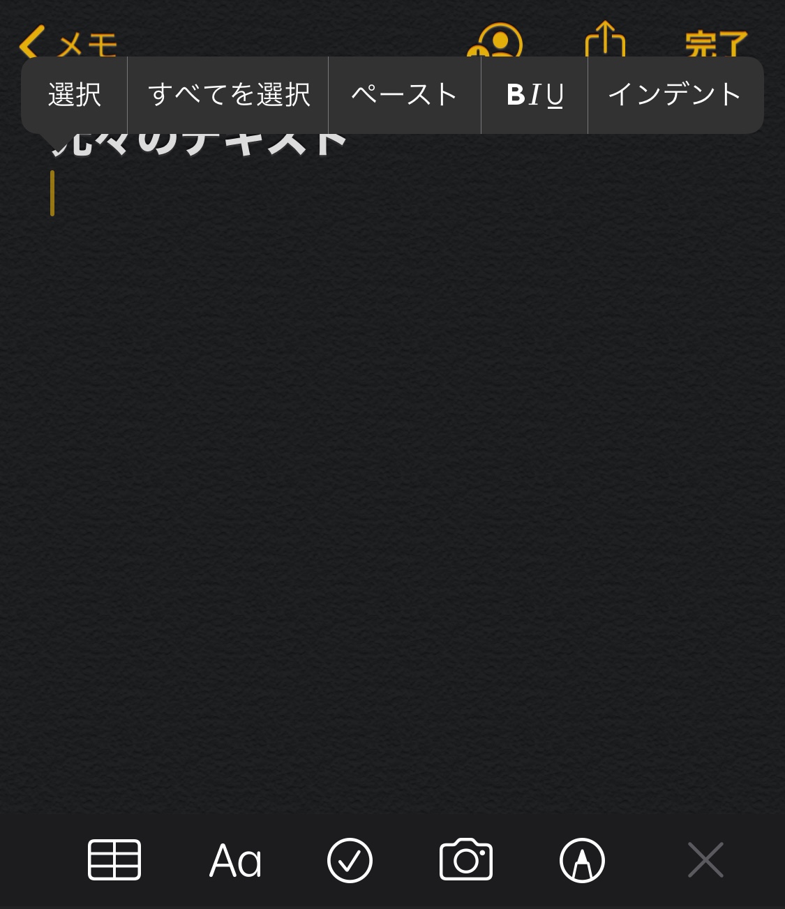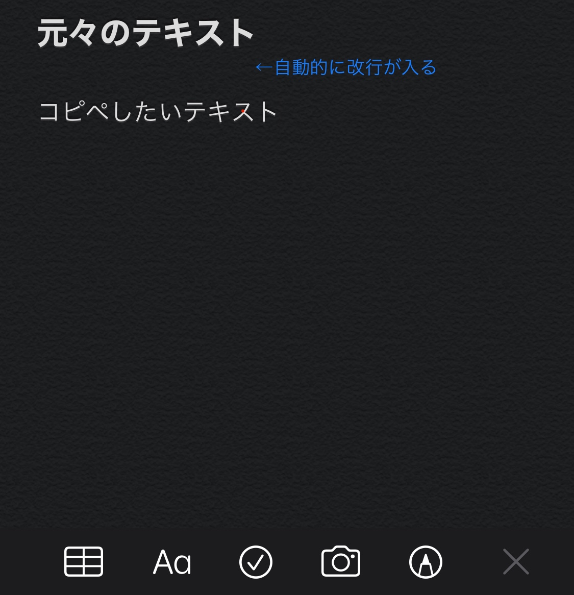 また、「メモ」アプリ内に限ったことではないのですが、改行で終わっているテキストに対して、それに続けて直下にコピー&ペーストを行いたいとき、ペーストしたテキストの上に勝手に改行が入ってしまい、毎回消す作業を行う羽目になってしまいます。
