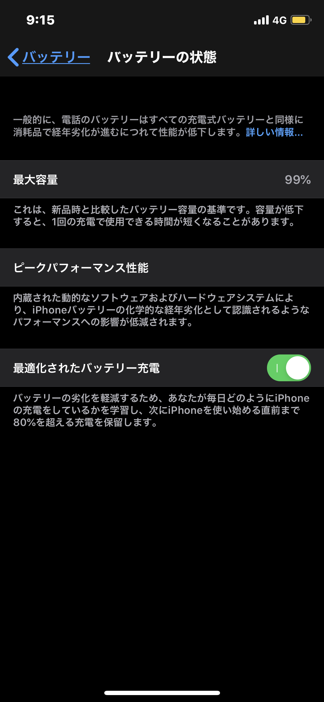 「バッテリーの状態」画面には、バッテリーの最大容量やピークパフォーマンス性能などの情報も表示されます。