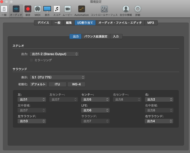 2、Logicの環境設定でオーディオ出力がステレオで選択されているかを確認(下画像)