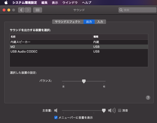1、システム環境設定のサウンドでパンがセンターにあるかどうか確認(下画像)