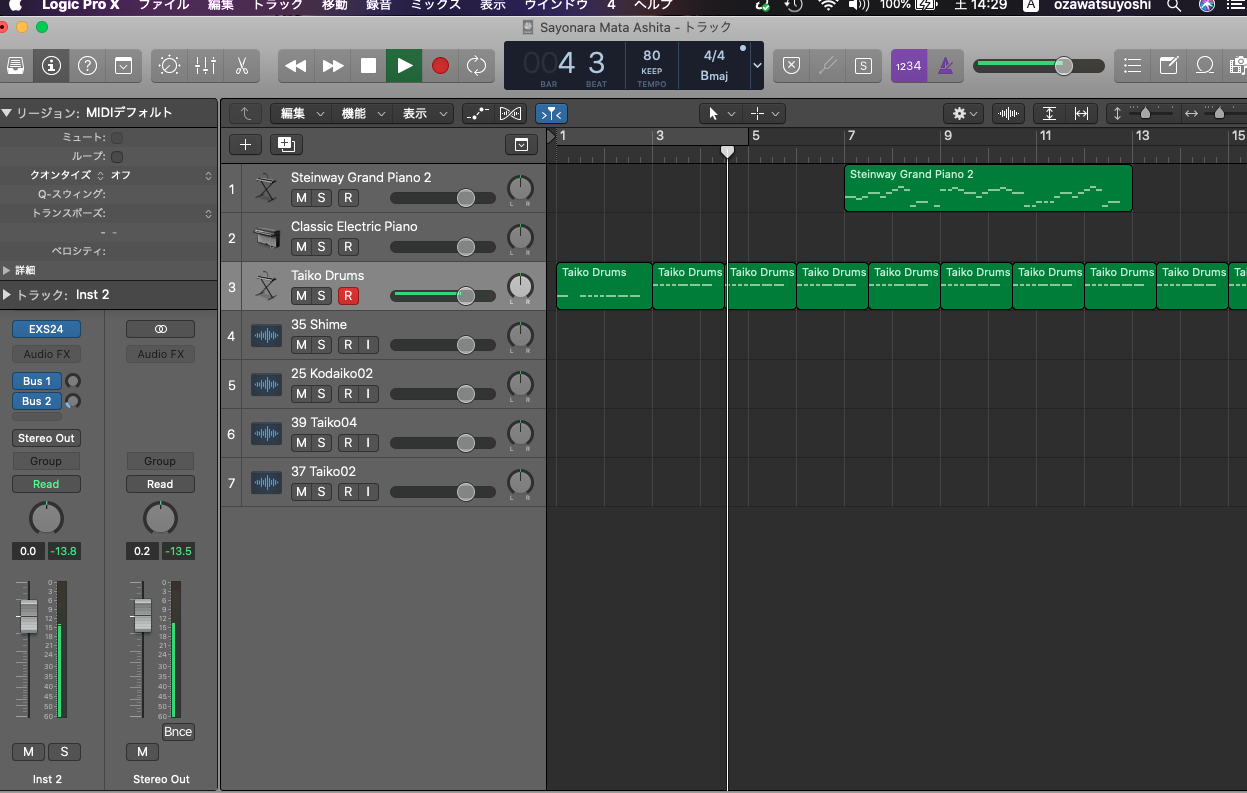 3、Logicの画面でチャンネルがステレオになっているか、またPanが左右に振られたりしていないか確認(下画像)