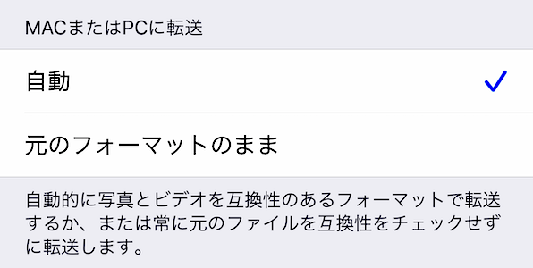“自動”を選択しておけば「ビデオを互換性のあるフォーマットで転送する」とのこと。