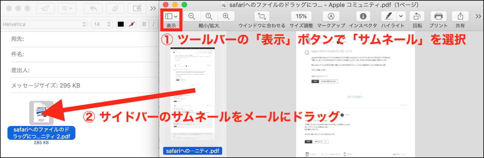 (私の書いた「サイドバーのサムネールをメールにドラッグ」は、PDF 書類内の選択したページを添付する方法なので、PDF 書類全体をメールに添付する場合は、「command」+「A」キーでサムネールを全選択する必要が有り、余計な手間が掛かってしまいます)