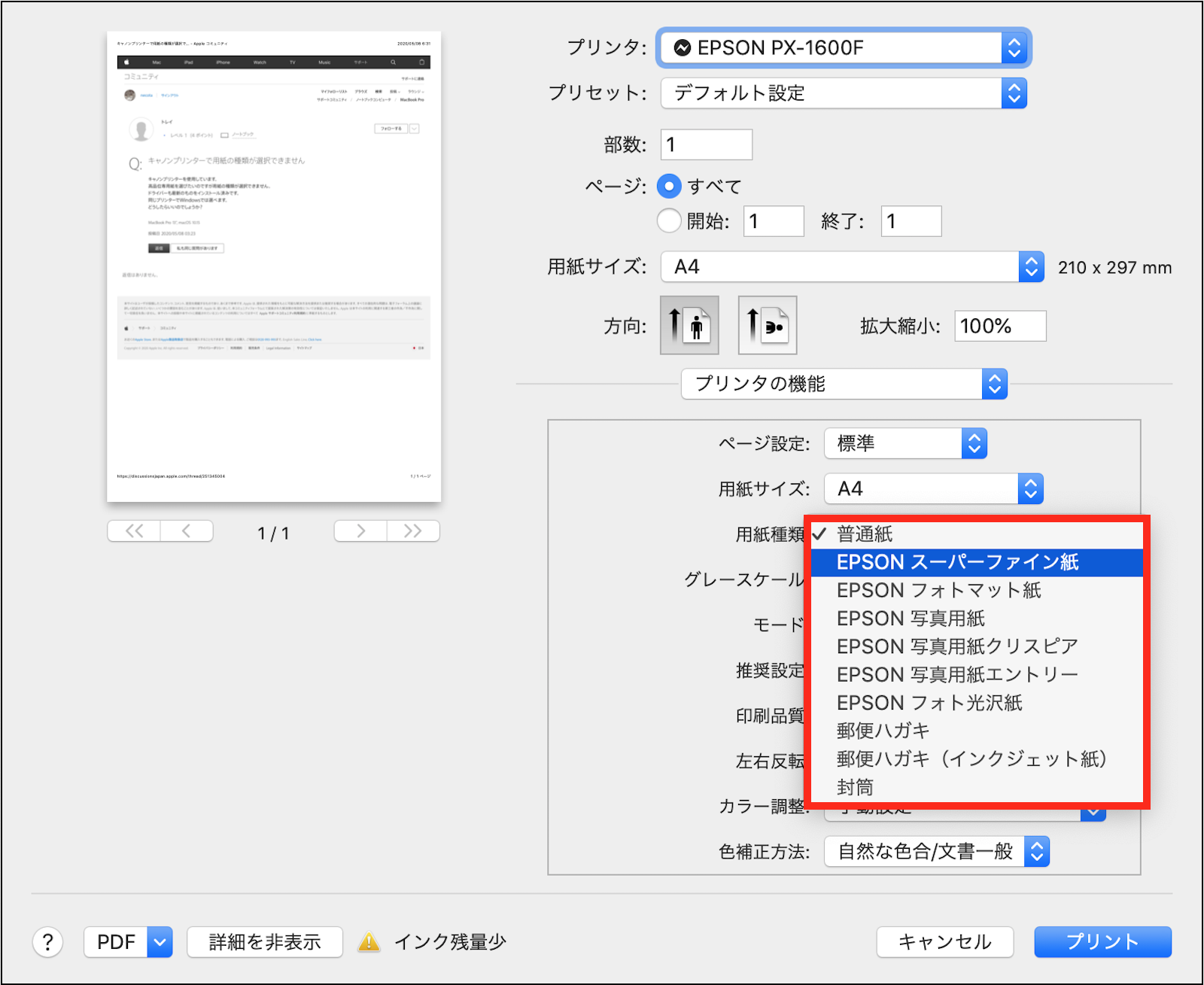 高品位専用紙を選びたいのですが用紙の種類が選択できません。