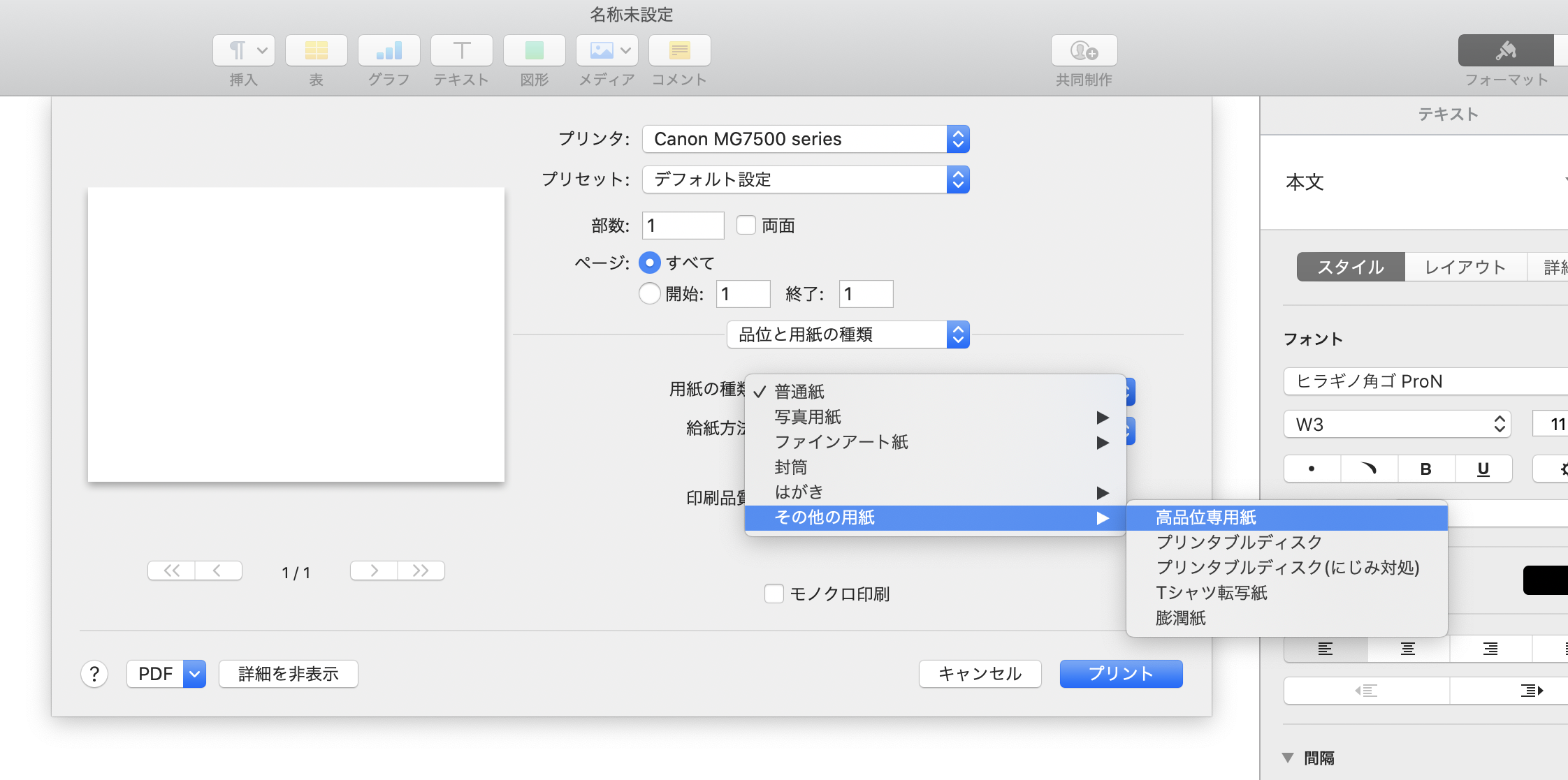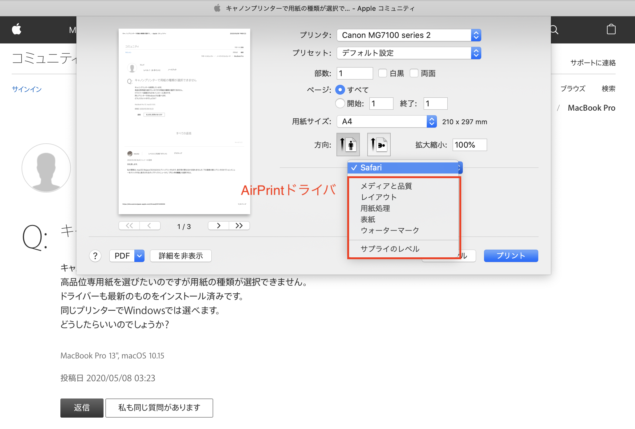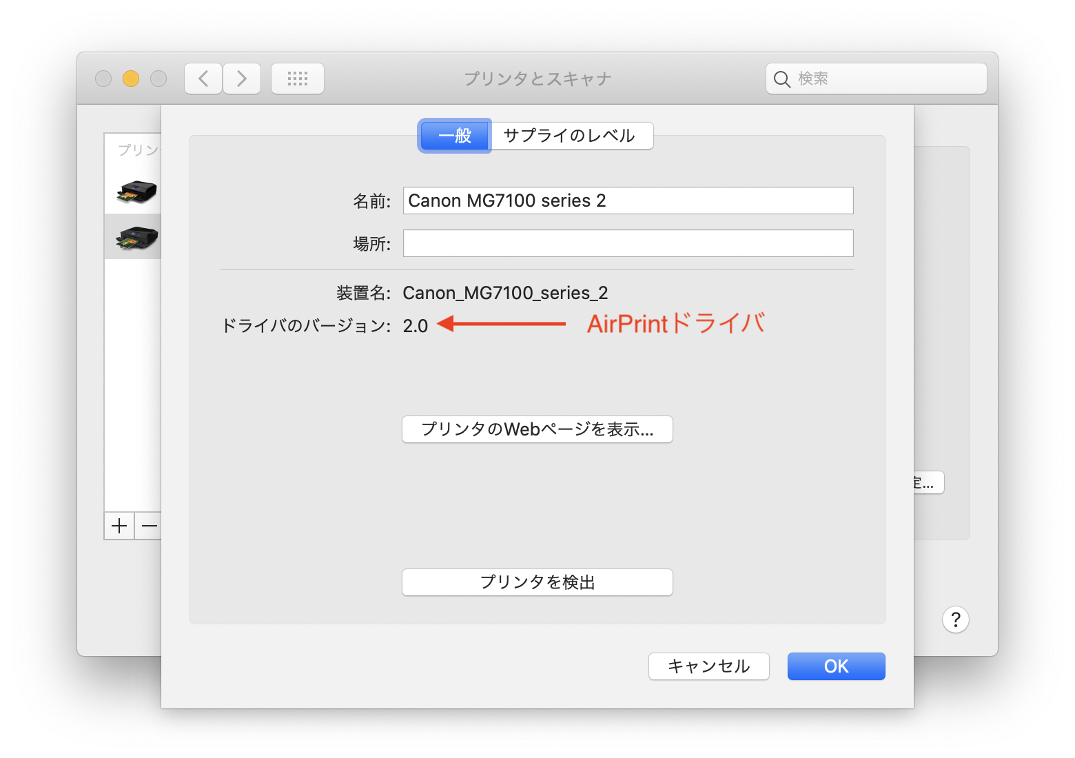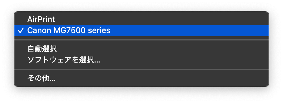例えばこちらの手元の Canon MG7530(種類:Bonjourマルチファンクション)の場合は、添付画像のように「AirPrint」と「Canon MG7500 series」が選べます。