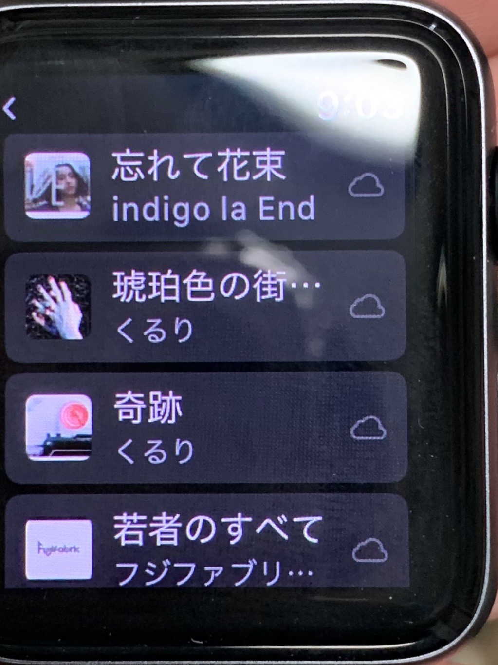 Applewatchにダウンロードした音楽を聴きたい時に、画像のように雲マークがある曲を聞くことができません。