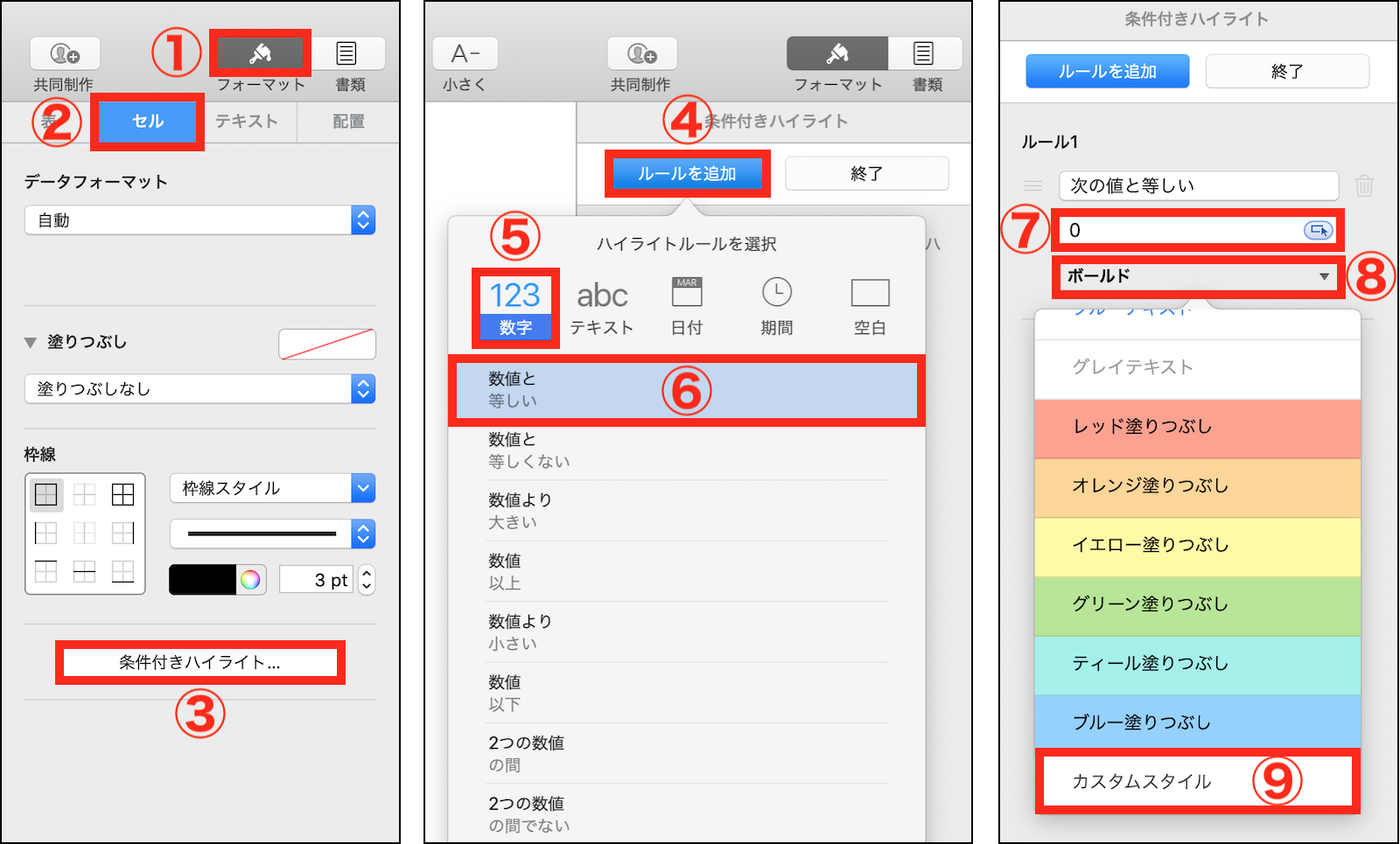 ルールの「次の値と等しい」の項目の下に有る、入力フィールドに「0」を入力し、デフォルトでは「ボールド」に設定されている、ハイライトの設定ボタンをクリックすると表示されるメニューから、「カスタムスタイル」を選択。