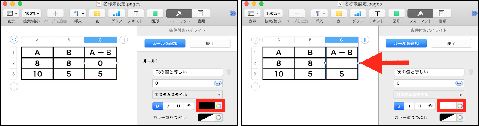 Pagesの表で計算した結果0の場合、非表示にしたいのですが、どうしたら良いのか教えてください。
