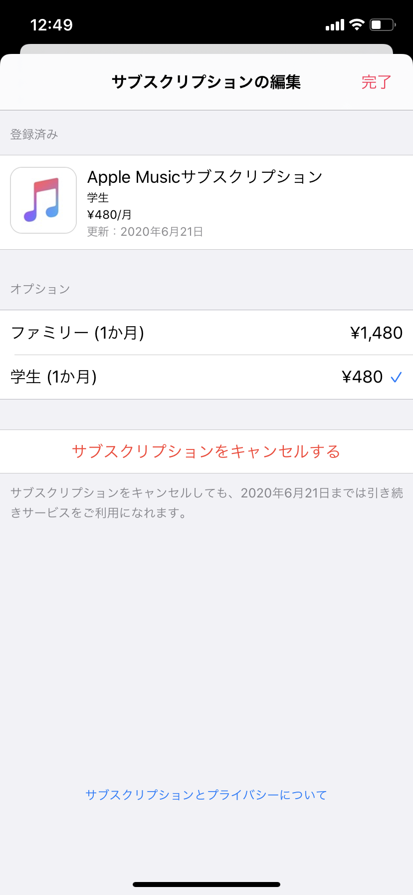 Apple Musicのサブスクリプションの変更