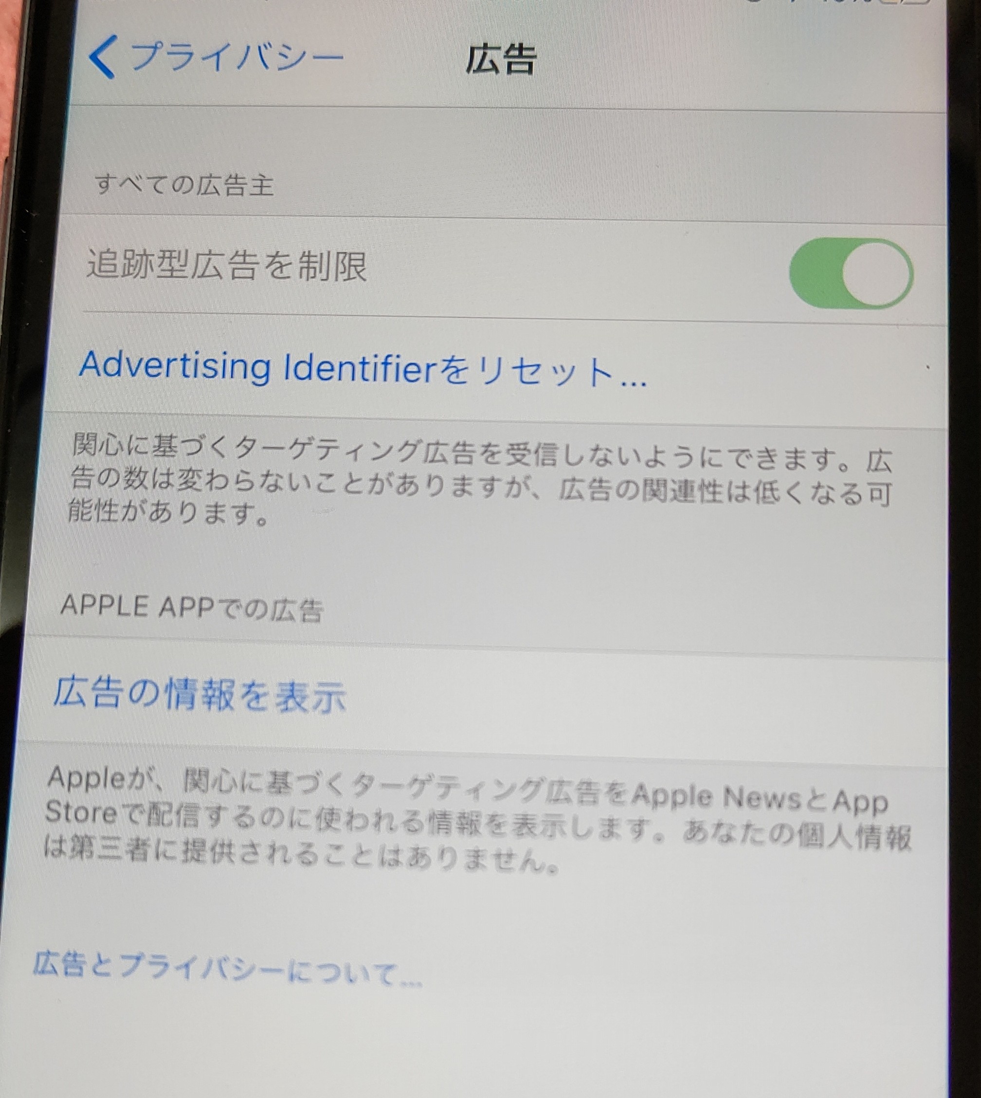 ダメ元で該当スライドスイッチの下に表示される「広告識別子をリセット」をタップしても変わりませんか…?