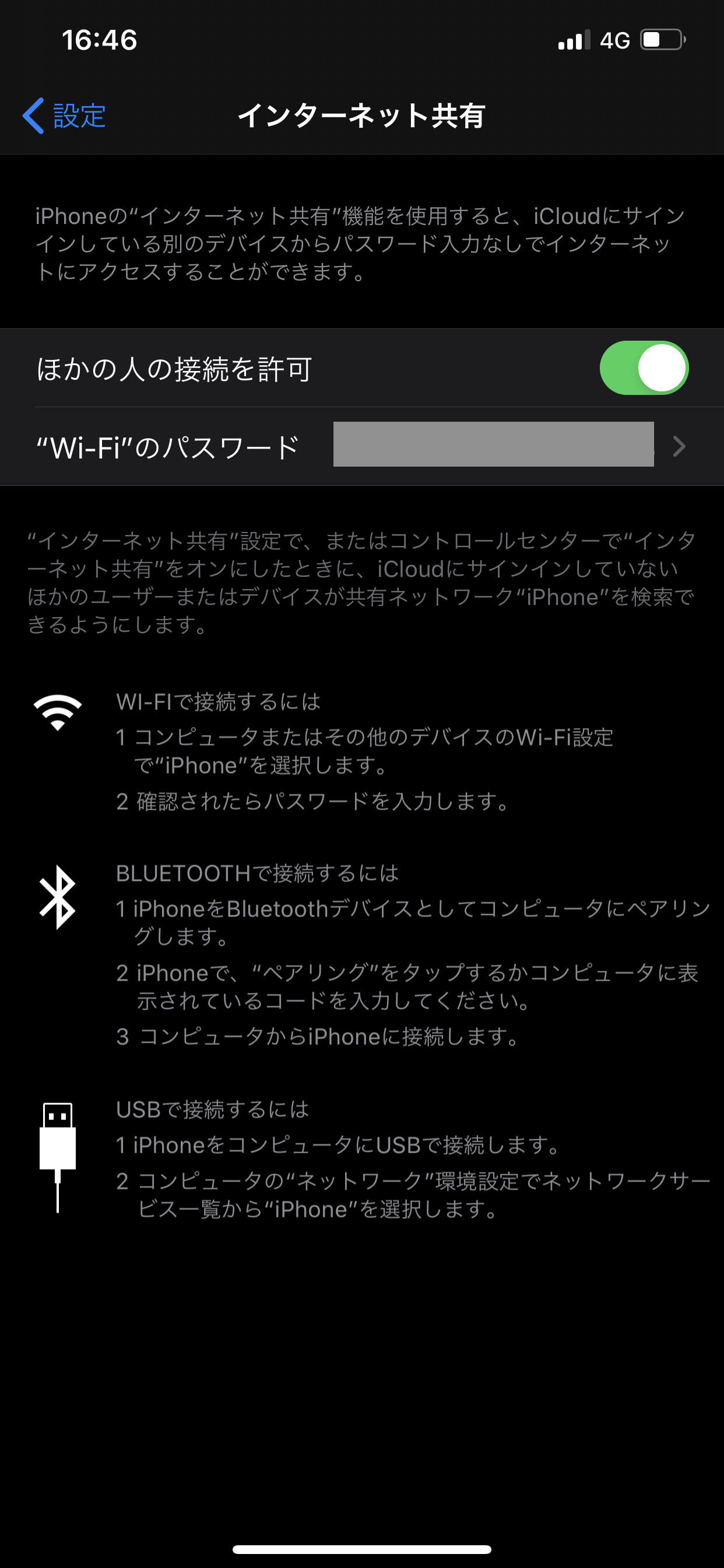 設定→インターネット共有→「ほかの人の接続を許可」をオンに。