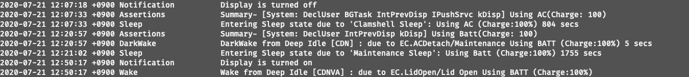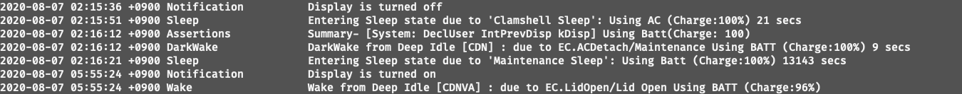 「pmset -g log | grep -e "Charge" -e "Display is turned" -e "Entering Sleep" -e "Wake from"」してみました。